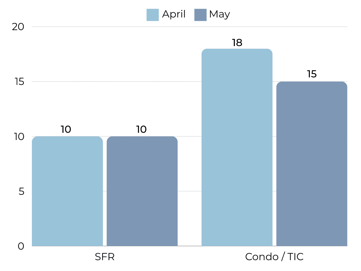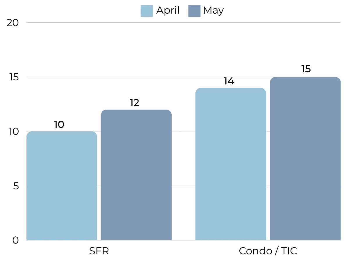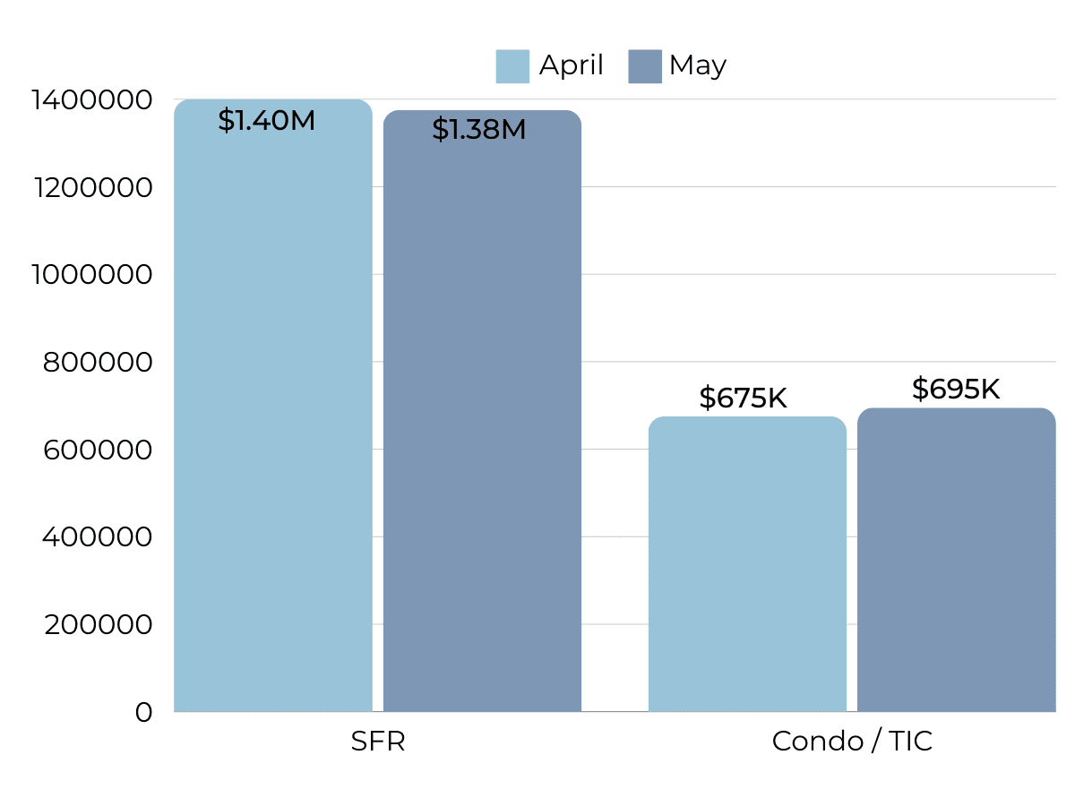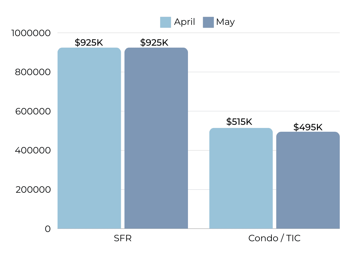 Months of Supply Inventory (MSI) quantifies the supply/demand relationship by measuring how many months it would take for all current homes listed on the market to sell at the current rate of sales. The long-term average MSI is around three months in California, which indicates a balanced market. An MSI lower than three indicates that there are more buyers than sellers on the market (meaning it’s a sellers’ market), while a higher MSI indicates there are more sellers than buyers (meaning it’s a buyers’ market). The East Bay market tends to favor sellers, which is reflected in its low MSI. MSI trended higher in the second half of 2023, moving above three months of supply for condos. From January to April 2024, however, the East Bay MSI fell significantly before rising slightly in May, indicating the housing market still favors sellers.
