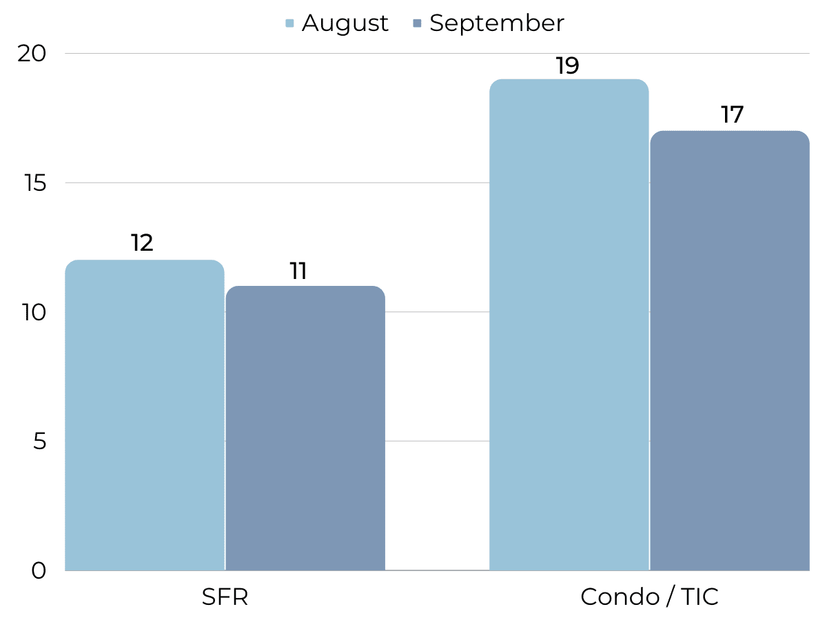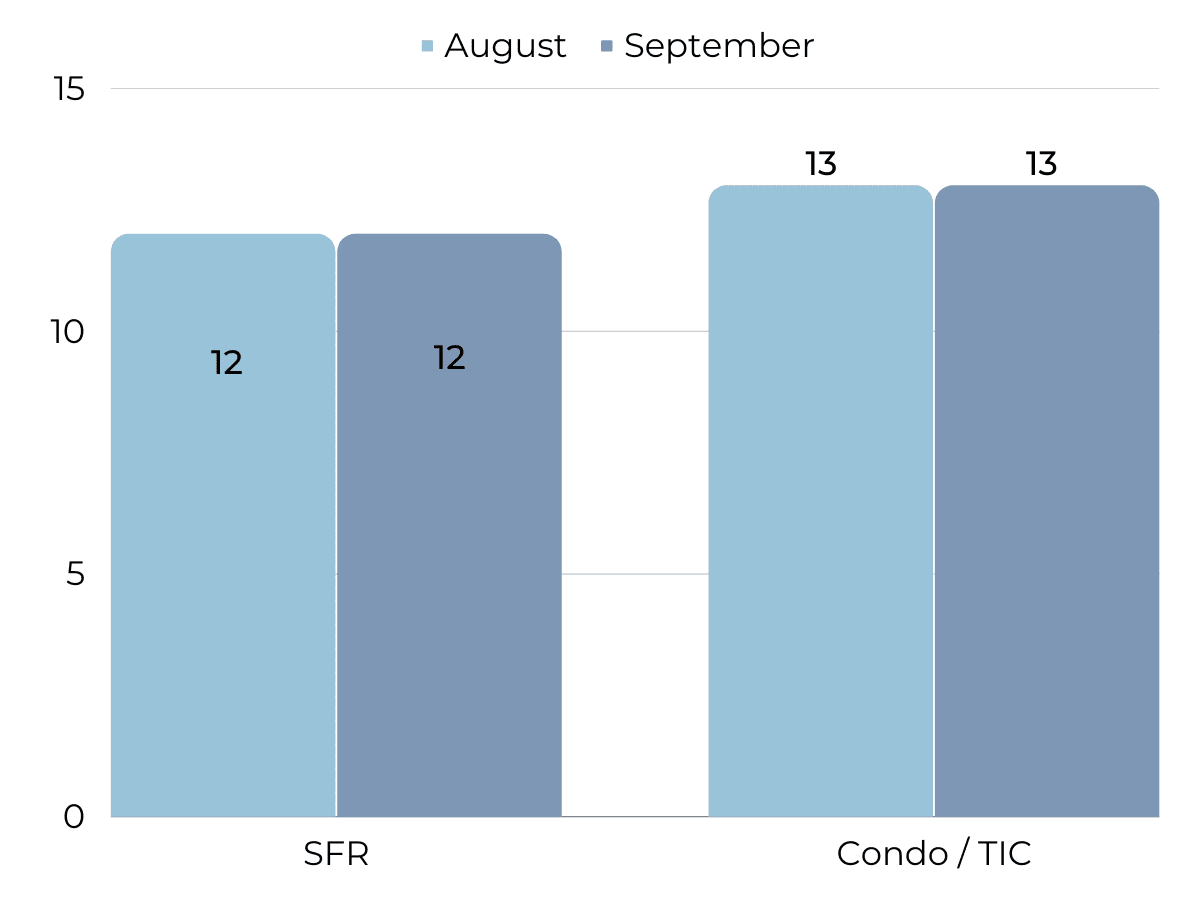 Months of Supply Inventory (MSI) quantifies the supply/demand relationship by measuring how many months it would take for all current homes listed on the market to sell at the current rate of sales. The long-term average MSI is around three months in California, which indicates a balanced market. An MSI lower than three indicates that there are more buyers than sellers on the market (meaning it’s a sellers’ market), while a higher MSI indicates there are more sellers than buyers (meaning it’s a buyers’ market). The East Bay market tends to favor sellers, which is reflected in its low MSI. MSI trended lower from January to May 2023 for both single-family homes and condos. Even with the slight increase in MSI over the summer months, the market still firmly favors sellers.