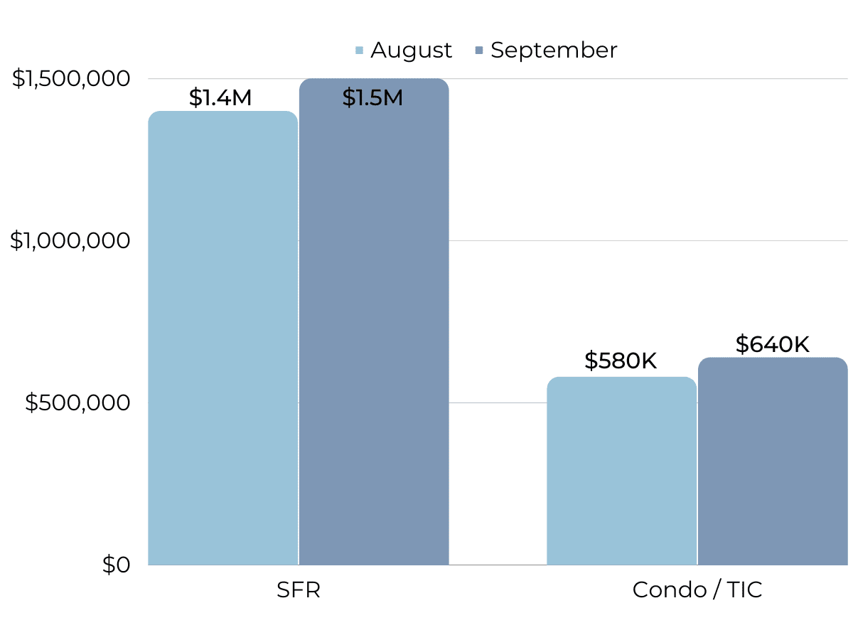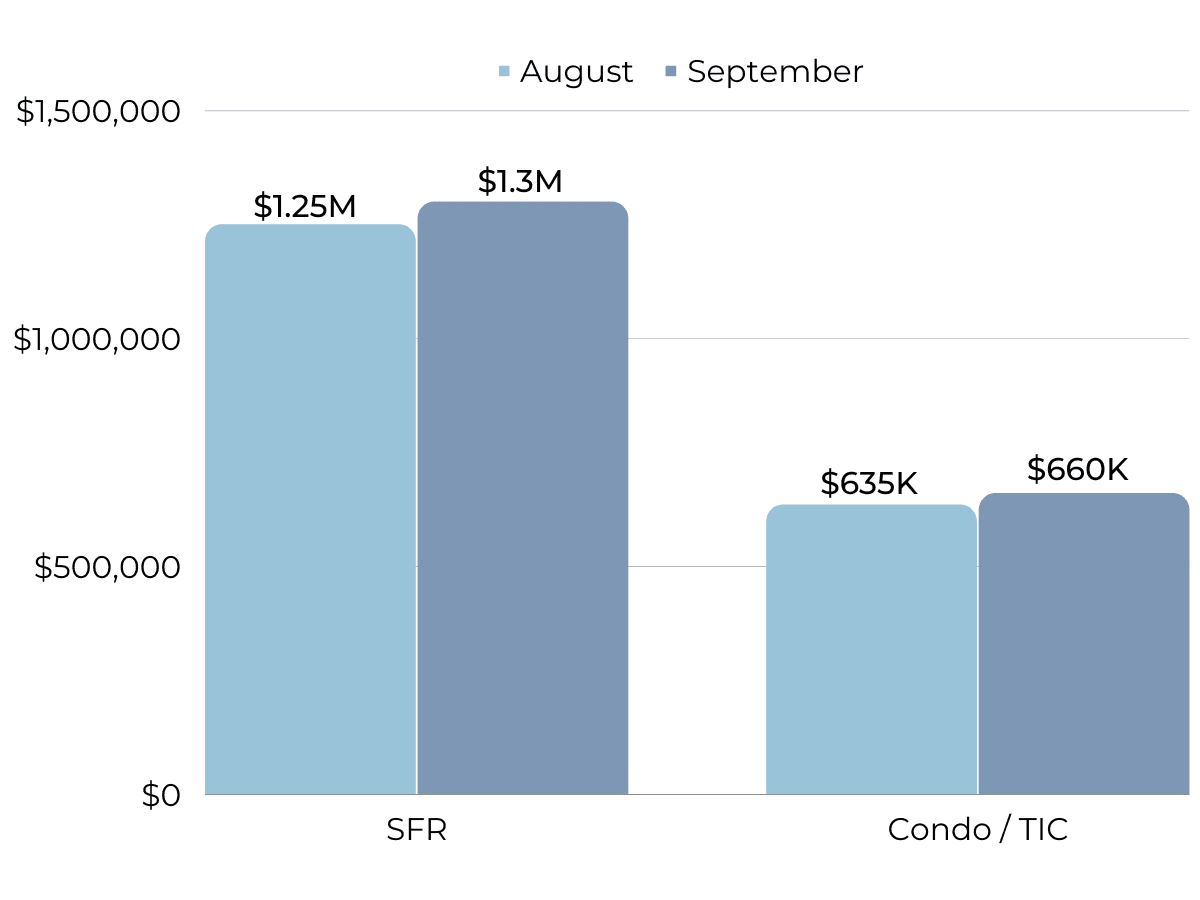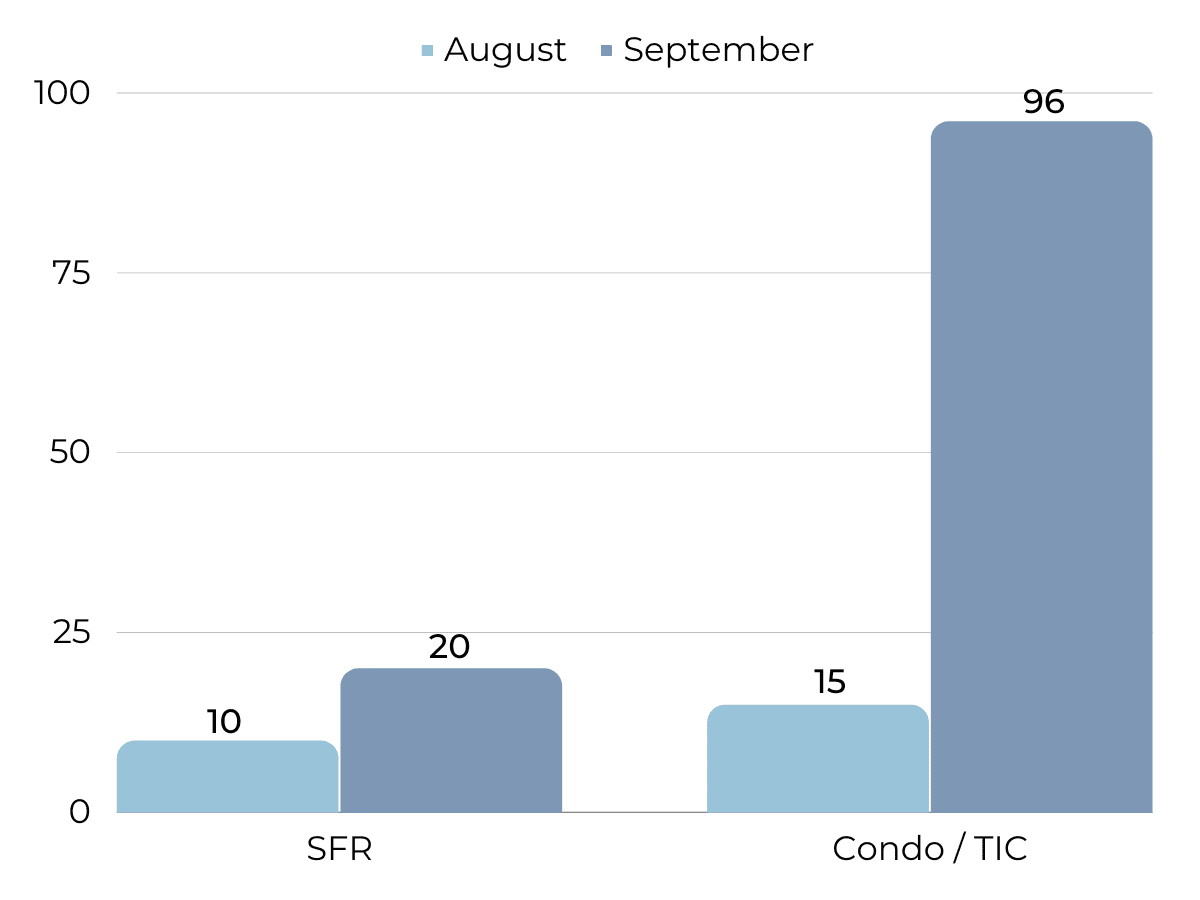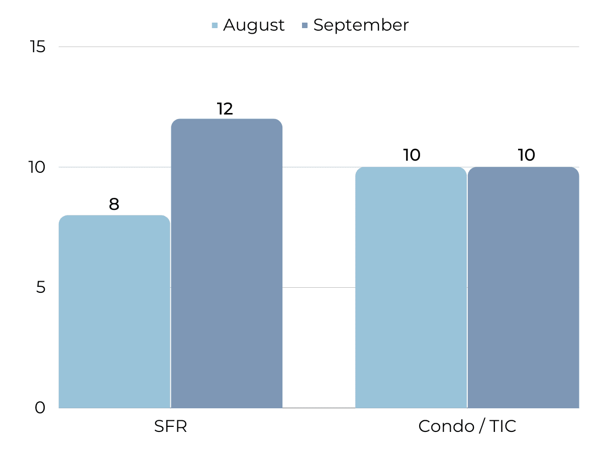 Single-family home and condo inventory, sales, and new listings trended higher year to date, although all remain at significantly depressed levels. Typically, inventory peaks in July or August and declines through December or January. Single-family home and condo inventory reached new highs for the year in August, but we will likely see fewer transactions in the coming months if normal seasonal trends hold. Currently, inventory is so low relative to demand that any amount of new listings is good for the market. However, new listings were unusually low this year, which has directly impacted both inventory and sales. The number of home sales is, in part, a function of the number of active listings and new listings coming to market. Since new listings and sales peaked in May 2023, sales declined 12%, while new listings fell 4%.