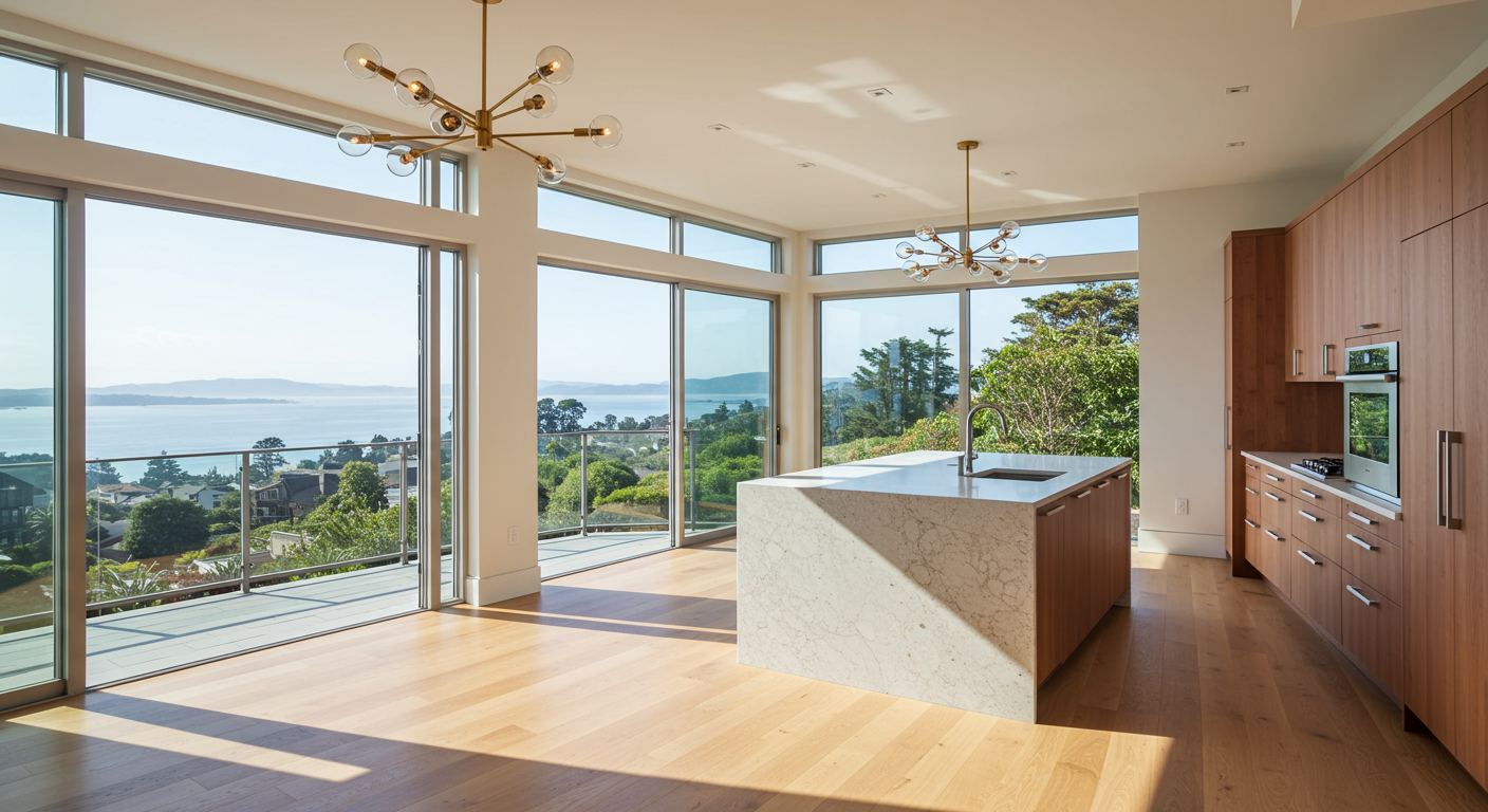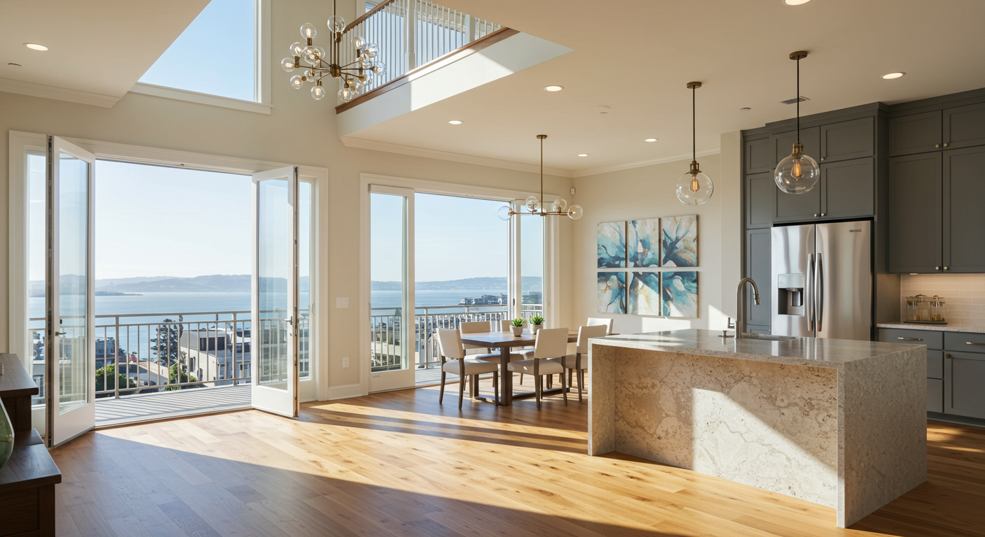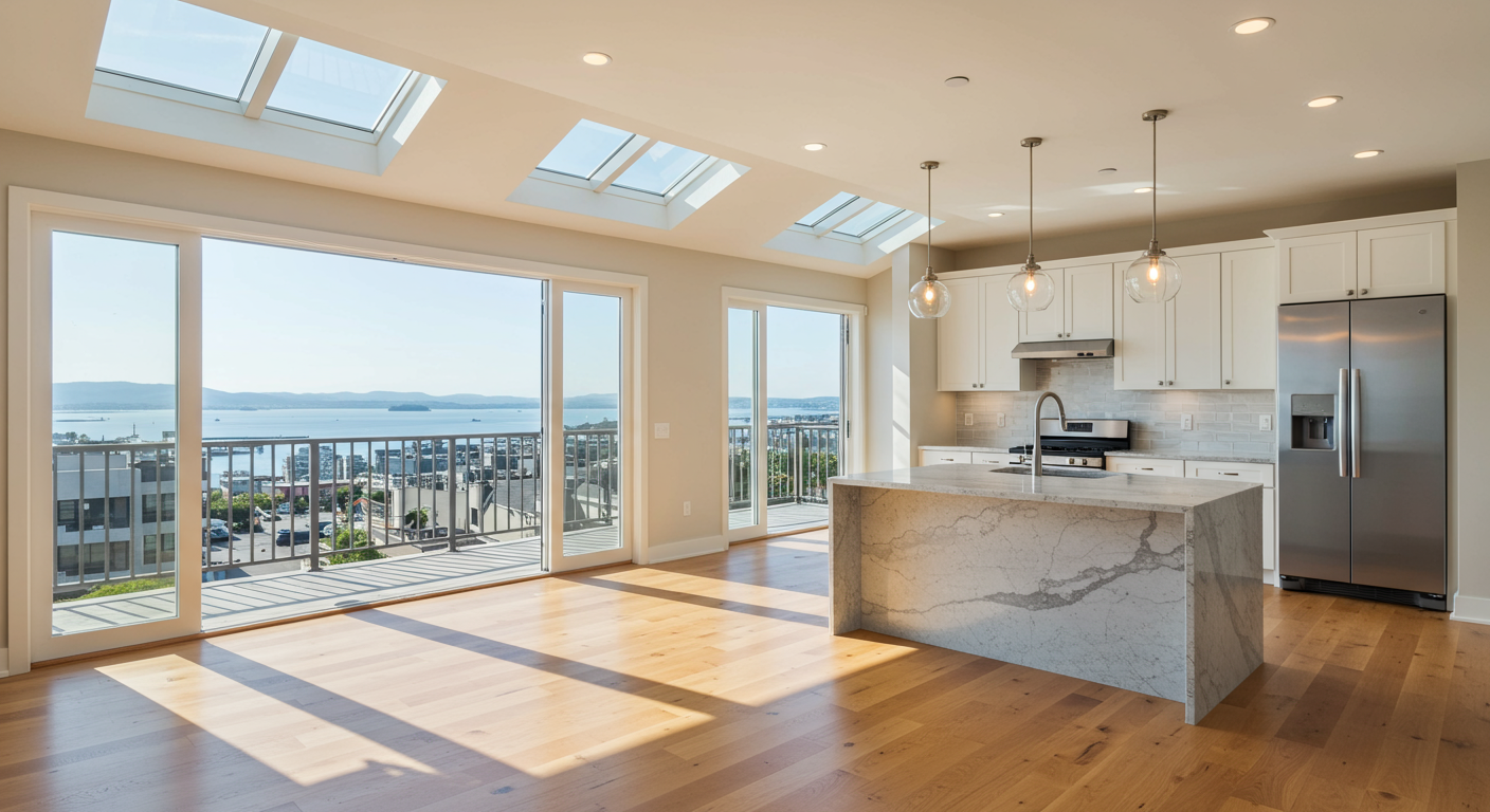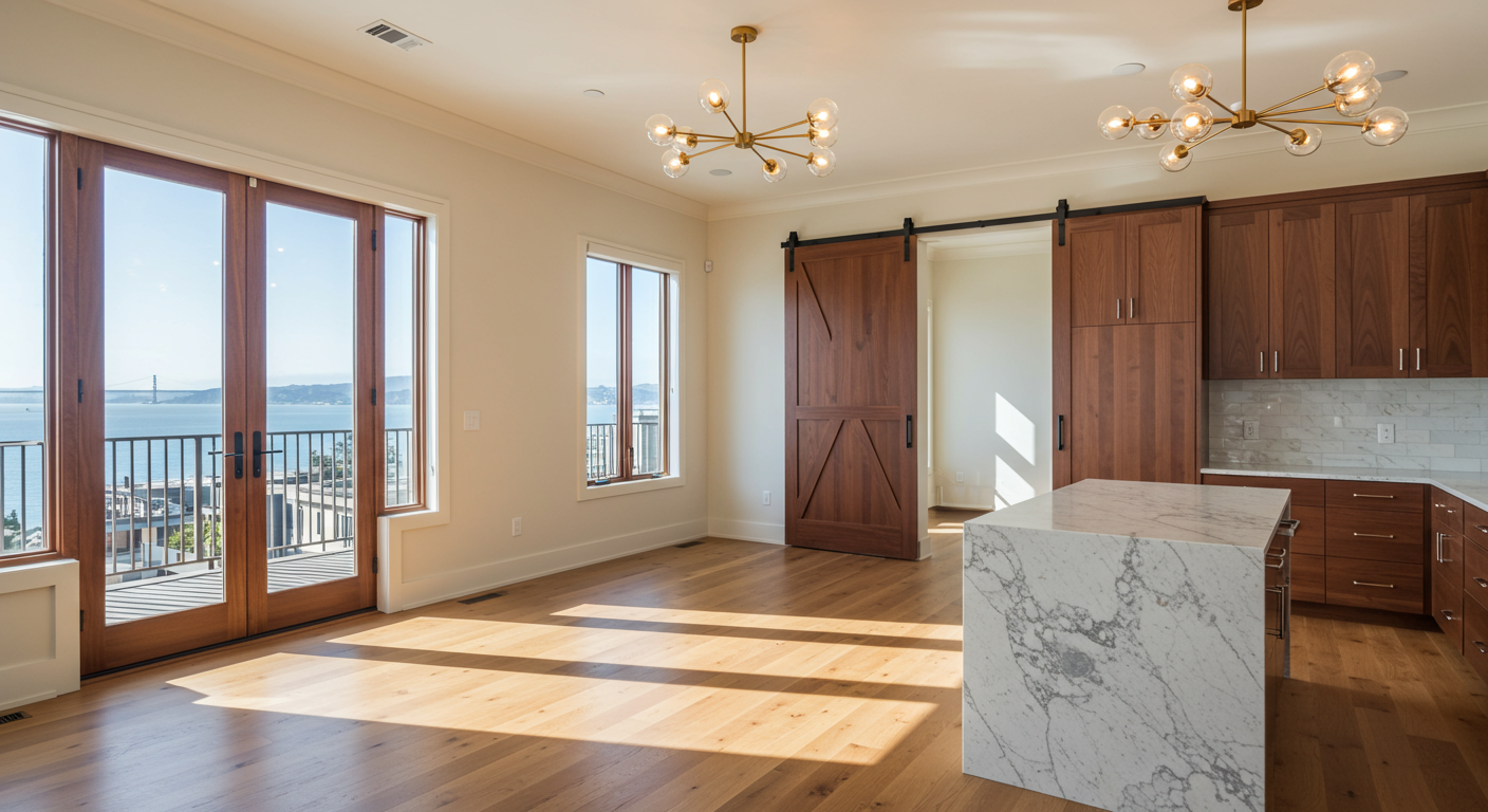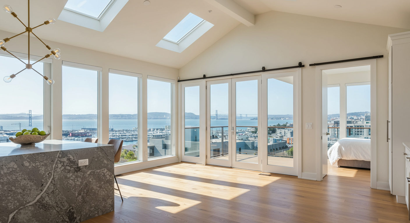 Ascend to the main level and experience an open concept living, dining and kitchen great room full of natural light from 4 skylights and wide patio doors, which leads to a balcony where you can bask in the spectacular Bay views. The gourmet kitchen offers modern conveniences, designer Walnut cabinetry and Thor Kitchen appliances, fit for the home chef. Entertaining made easy with a stunning waterfall natural stone kitchen island. Wide-plank European Oak hardwood floors highlight the flow of the home. Mahogany double barn door with Capiz Shells divides the living room and a large Bedroom with Marina-style windows at the front of the house.