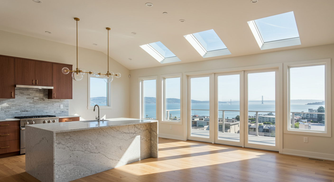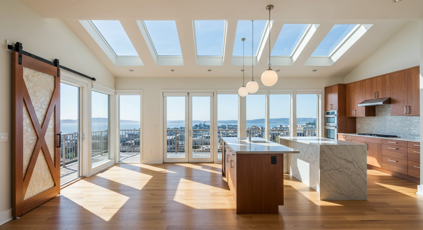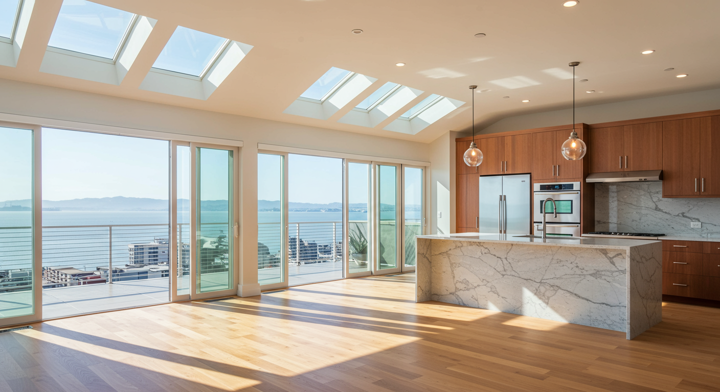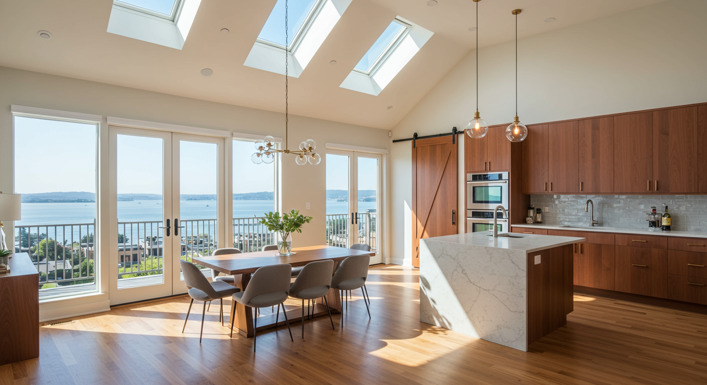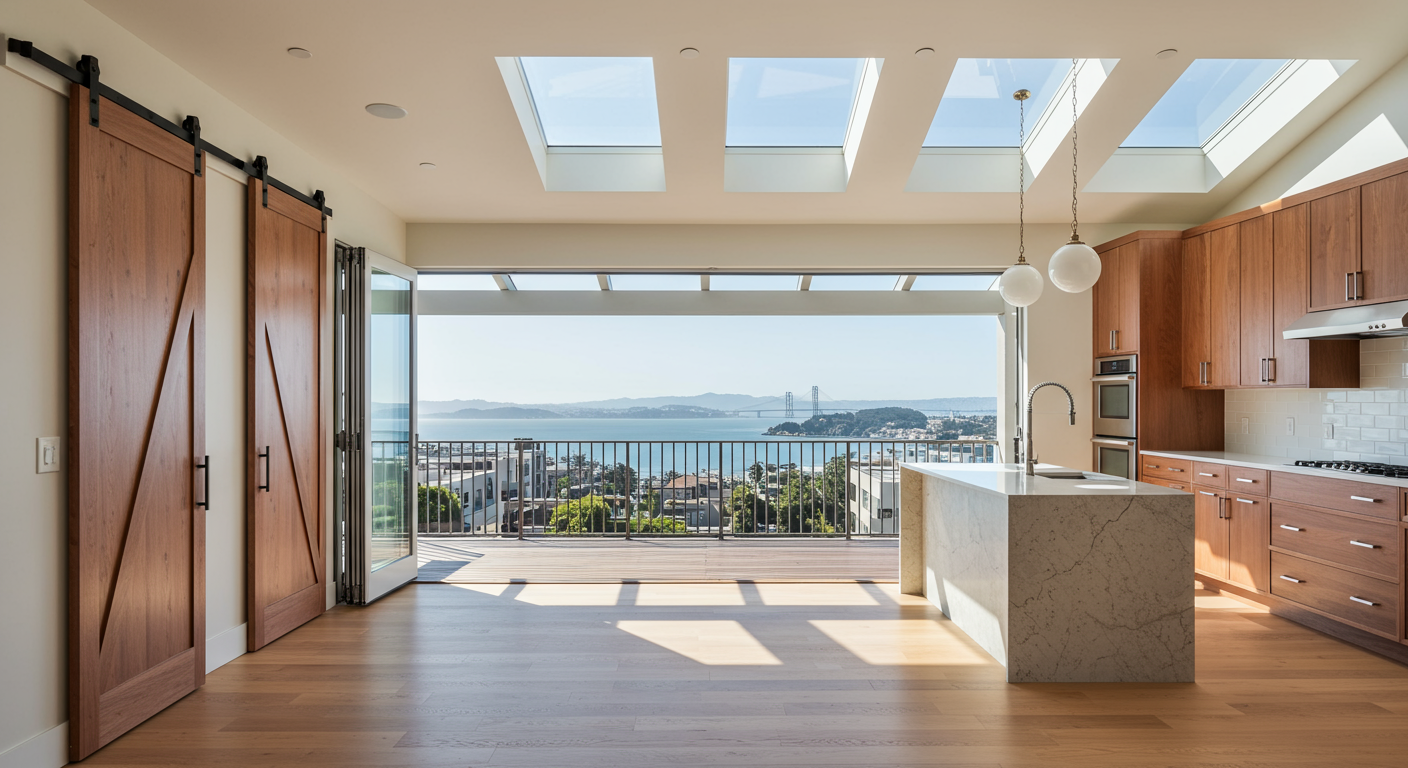 Ascend to the main level and experience an open concept living, dining and kitchen great room full of natural light from 4 skylights and wide patio doors, which leads to a balcony where you can bask in the spectacular Bay views. The gourmet kitchen offers modern conveniences, designer Walnut cabinetry and Thor Kitchen appliances, fit for the home chef. Entertaining made easy with a stunning waterfall natural stone kitchen island. Wide-plank European Oak hardwood floors highlight the flow of the home. Mahogany double barn door with Capiz Shells divides the living room and a large Bedroom with Marina-style windows at the front of the house.
