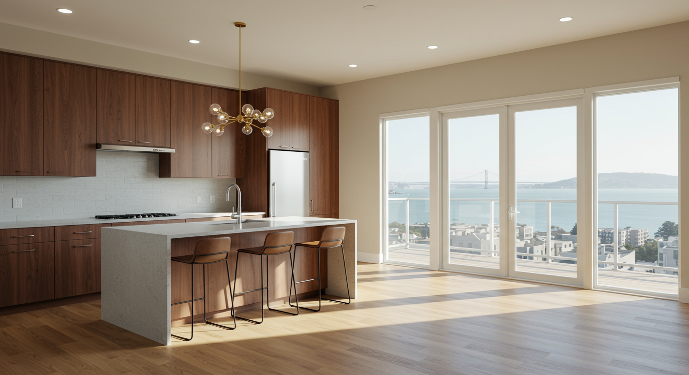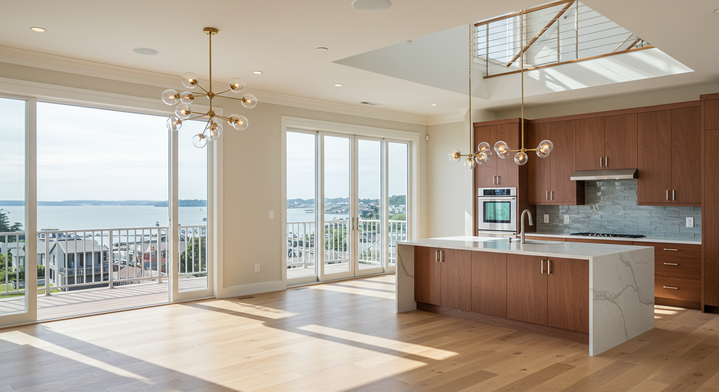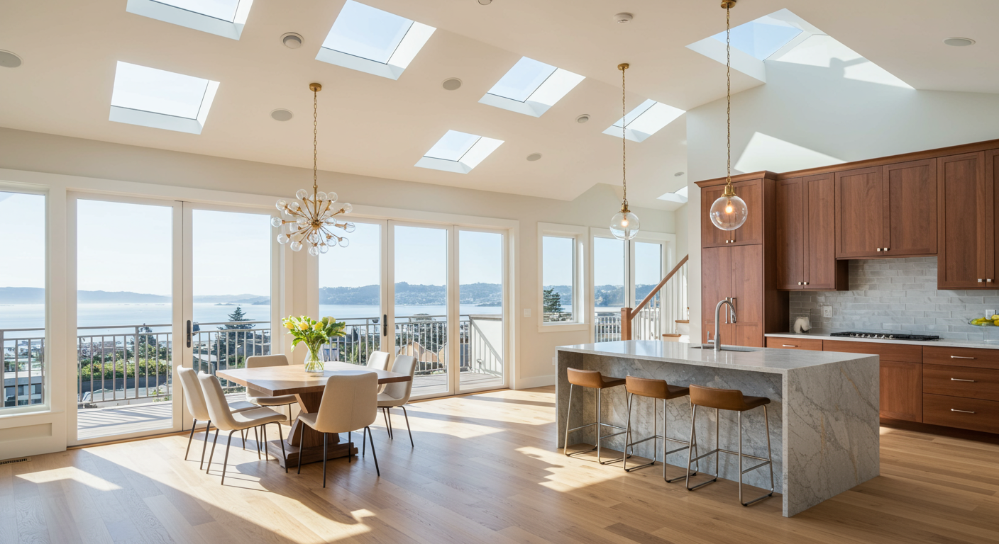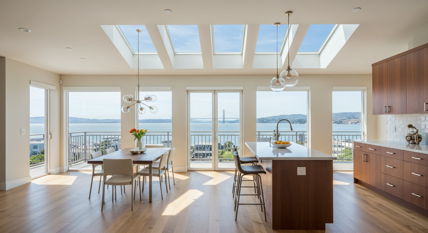 Ascend to the main level and experience an open concept living, dining and kitchen great room full of natural light from 4 skylights and wide patio doors, which leads to a balcony where you can bask in the spectacular Bay views. The gourmet kitchen offers modern conveniences, designer Walnut cabinetry and Thor Kitchen appliances, fit for the home chef. Entertaining made easy with a stunning waterfall natural stone kitchen island. Wide-plank European Oak hardwood floors highlight the flow of the home. Mahogany double barn door with Capiz Shells divides the living room and a large Bedroom with Marina-style windows at the front of the house.