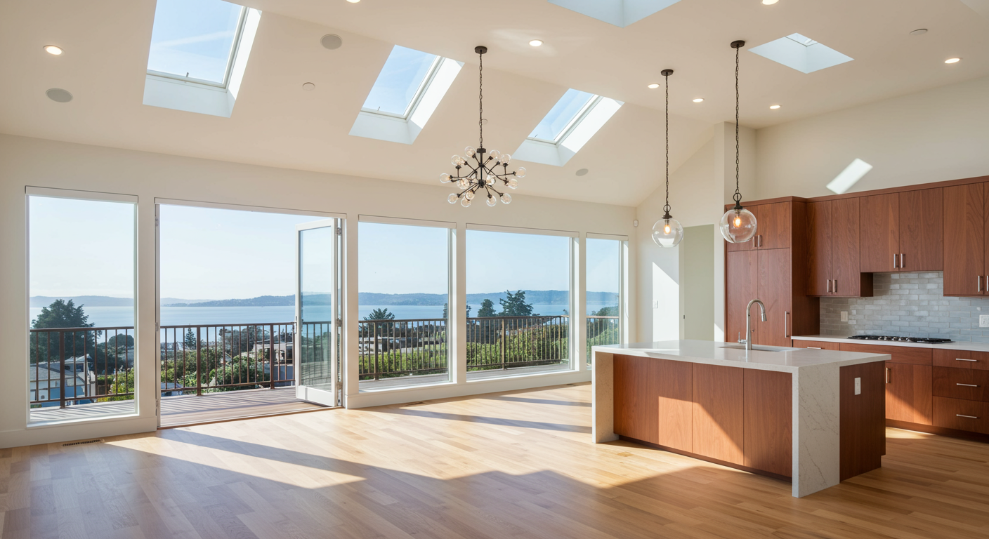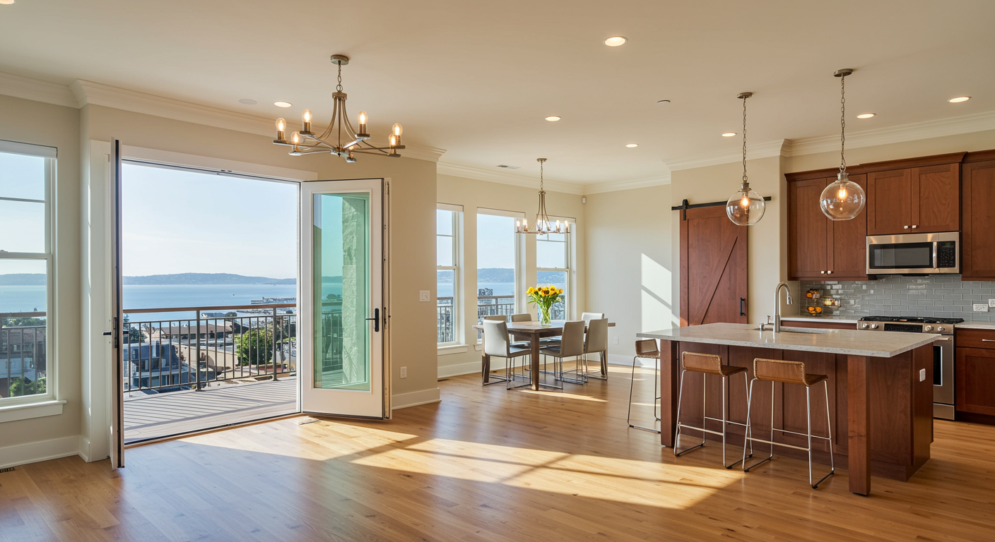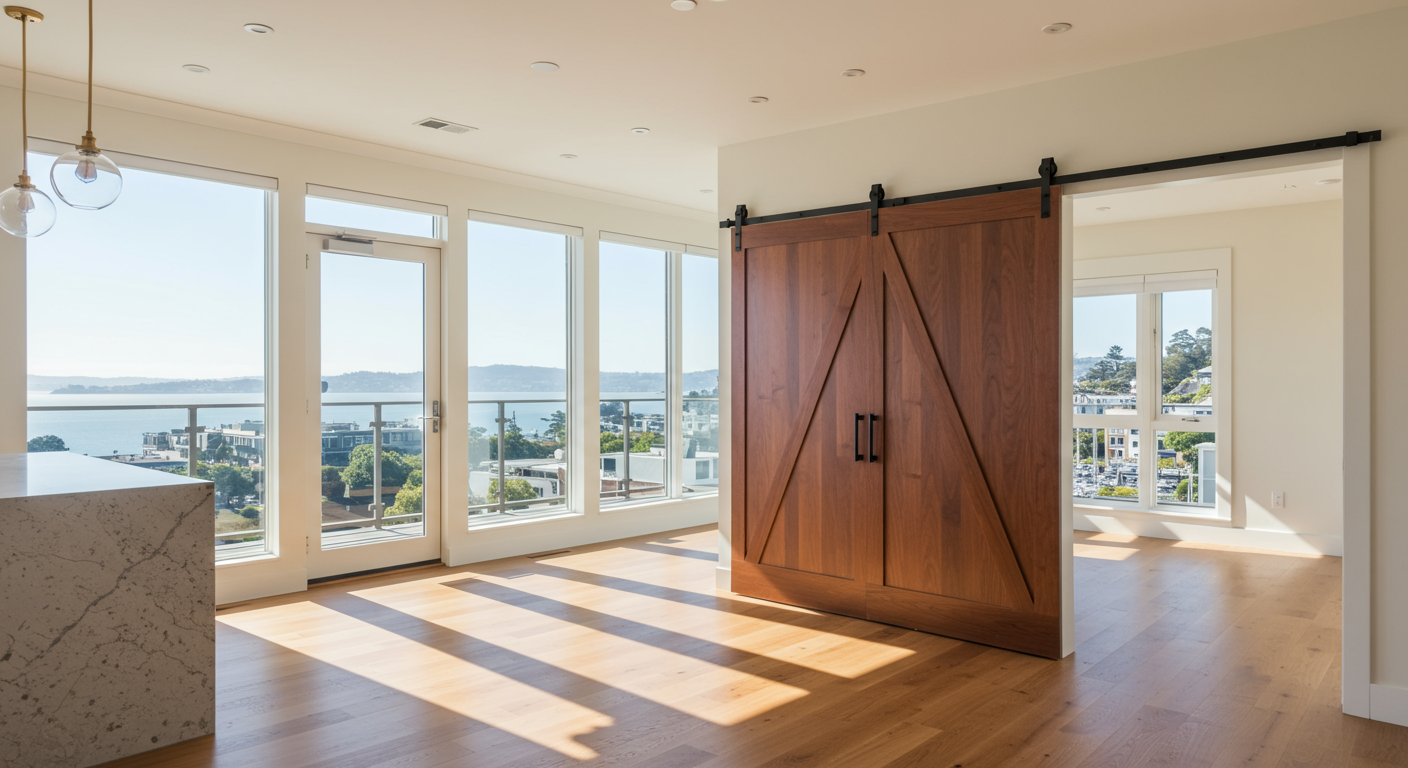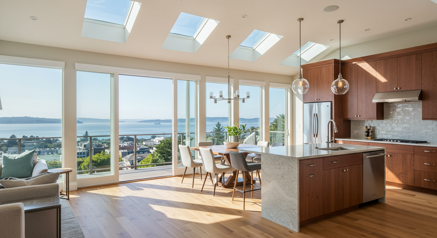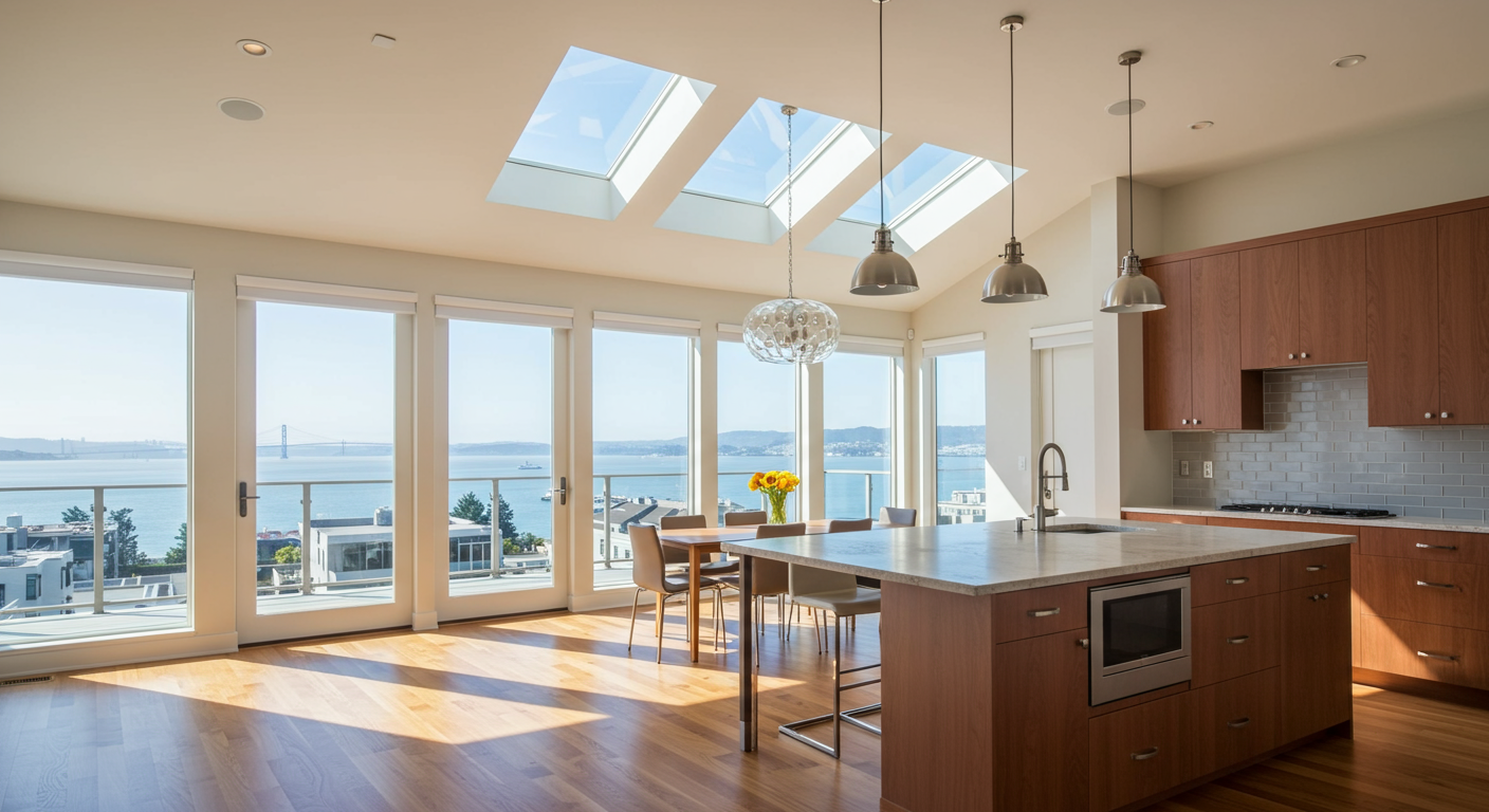 Ascend to the main level and experience an open concept living, dining and kitchen great room full of natural light from 4 skylights and wide patio doors, which leads to a balcony where you can bask in the spectacular Bay views. The gourmet kitchen offers modern conveniences, designer Walnut cabinetry and Thor Kitchen appliances, fit for the home chef. Entertaining made easy with a stunning waterfall natural stone kitchen island. Wide-plank European Oak hardwood floors highlight the flow of the home. Mahogany double barn door with Capiz Shells divides the living room and a large Bedroom with Marina-style windows at the front of the house.