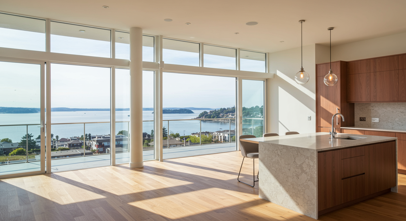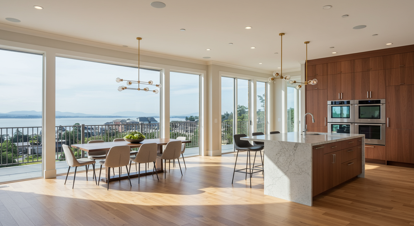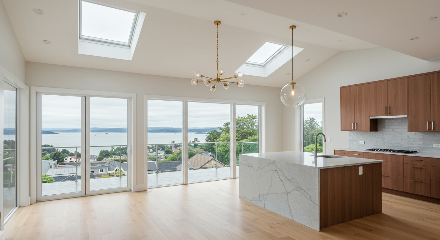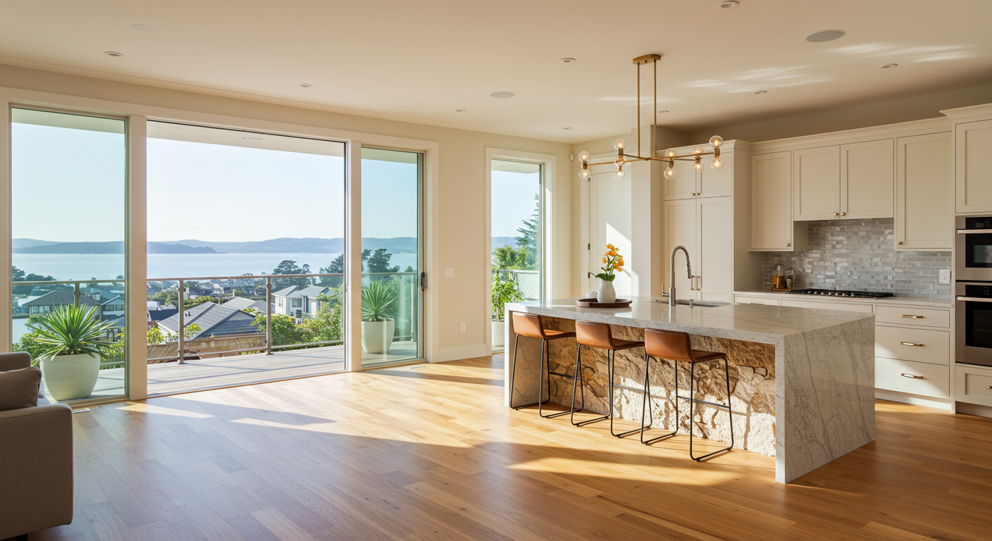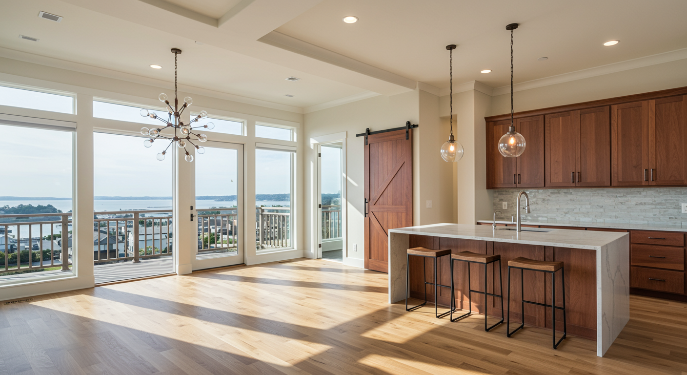 Ascend to the main level and experience an open concept living, dining and kitchen great room full of natural light from 4 skylights and wide patio doors, which leads to a balcony where you can bask in the spectacular Bay views. The gourmet kitchen offers modern conveniences, designer Walnut cabinetry and Thor Kitchen appliances, fit for the home chef. Entertaining made easy with a stunning waterfall natural stone kitchen island. Wide-plank European Oak hardwood floors highlight the flow of the home. Mahogany double barn door with Capiz Shells divides the living room and a large Bedroom with Marina-style windows at the front of the house.