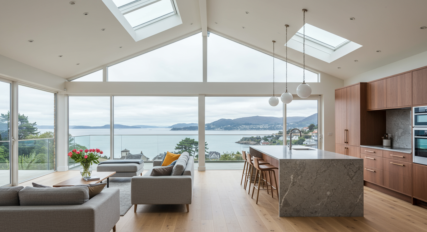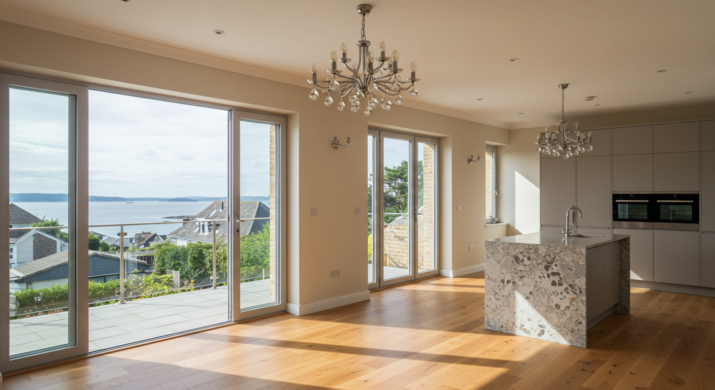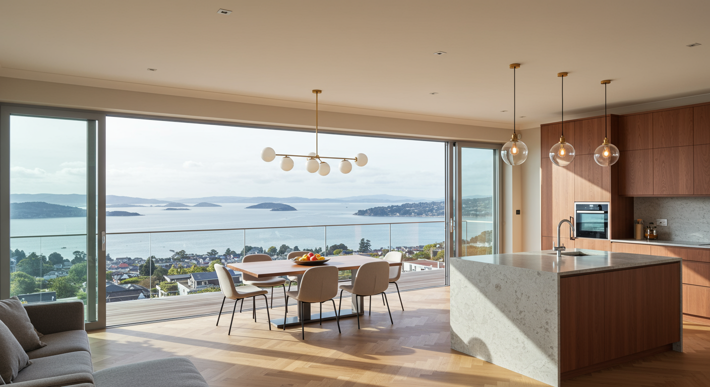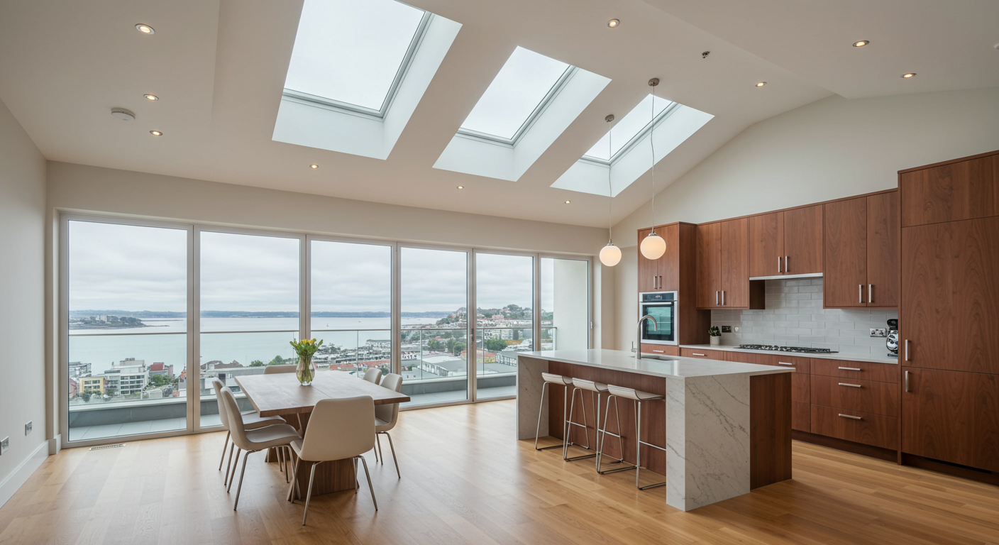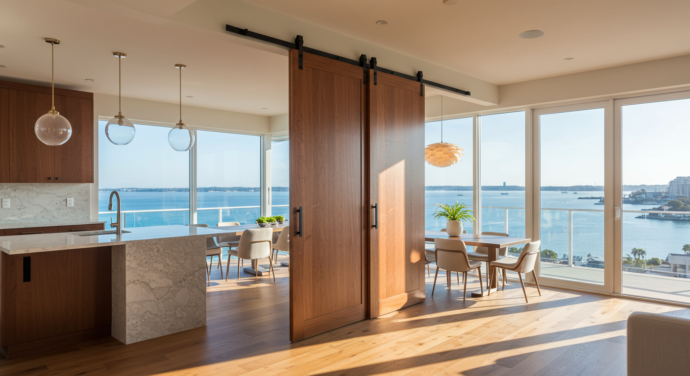 Ascend to the main level and experience an open concept living, dining and kitchen great room full of natural light from 4 skylights and wide patio doors, which leads to a balcony where you can bask in the spectacular Bay views. The gourmet kitchen offers modern conveniences, designer Walnut cabinetry and Thor Kitchen appliances, fit for the home chef. Entertaining made easy with a stunning waterfall natural stone kitchen island. Wide-plank European Oak hardwood floors highlight the flow of the home. Mahogany double barn door with Capiz Shells divides the living room and a large Bedroom with Marina-style windows at the front of the house.