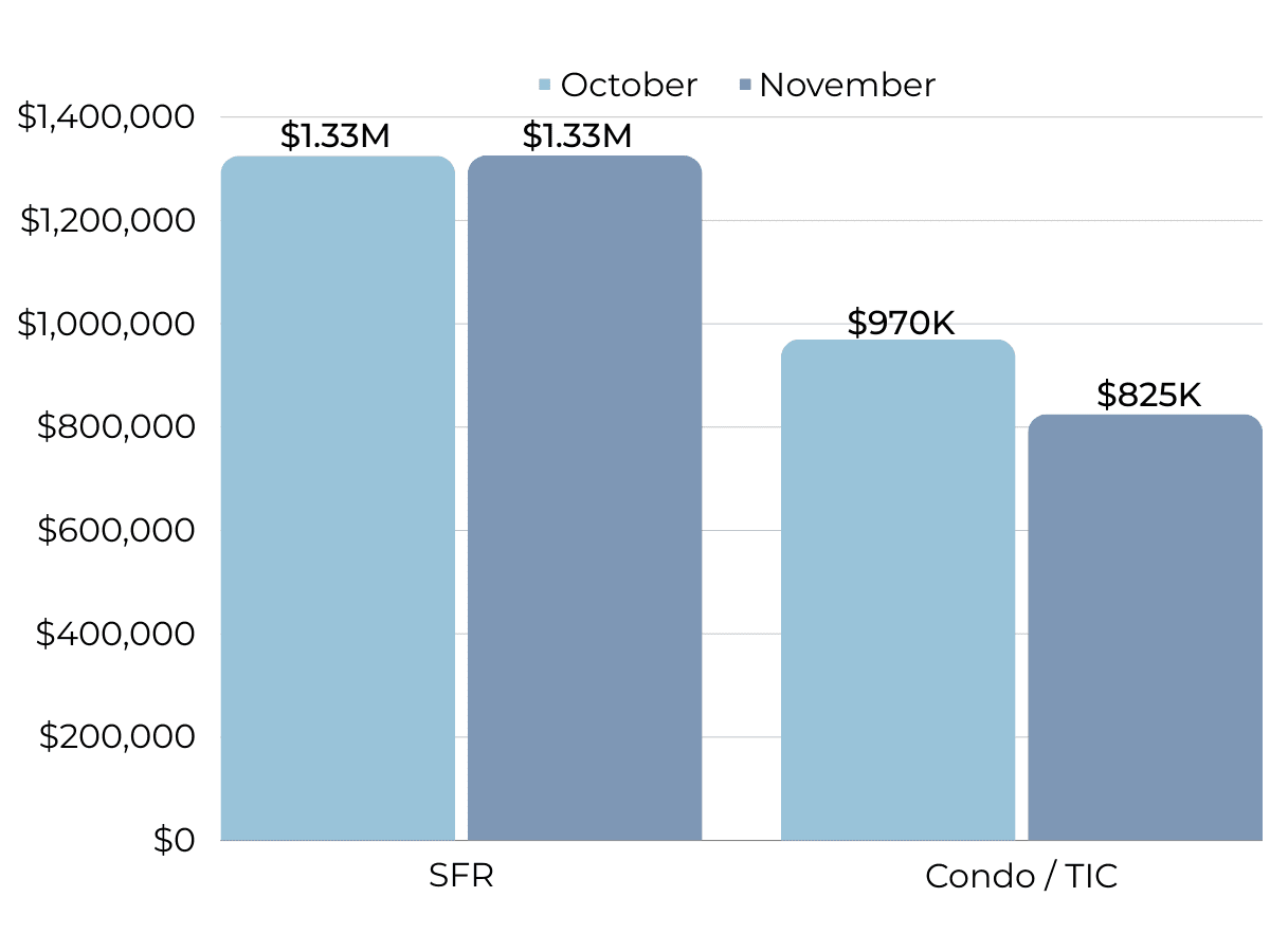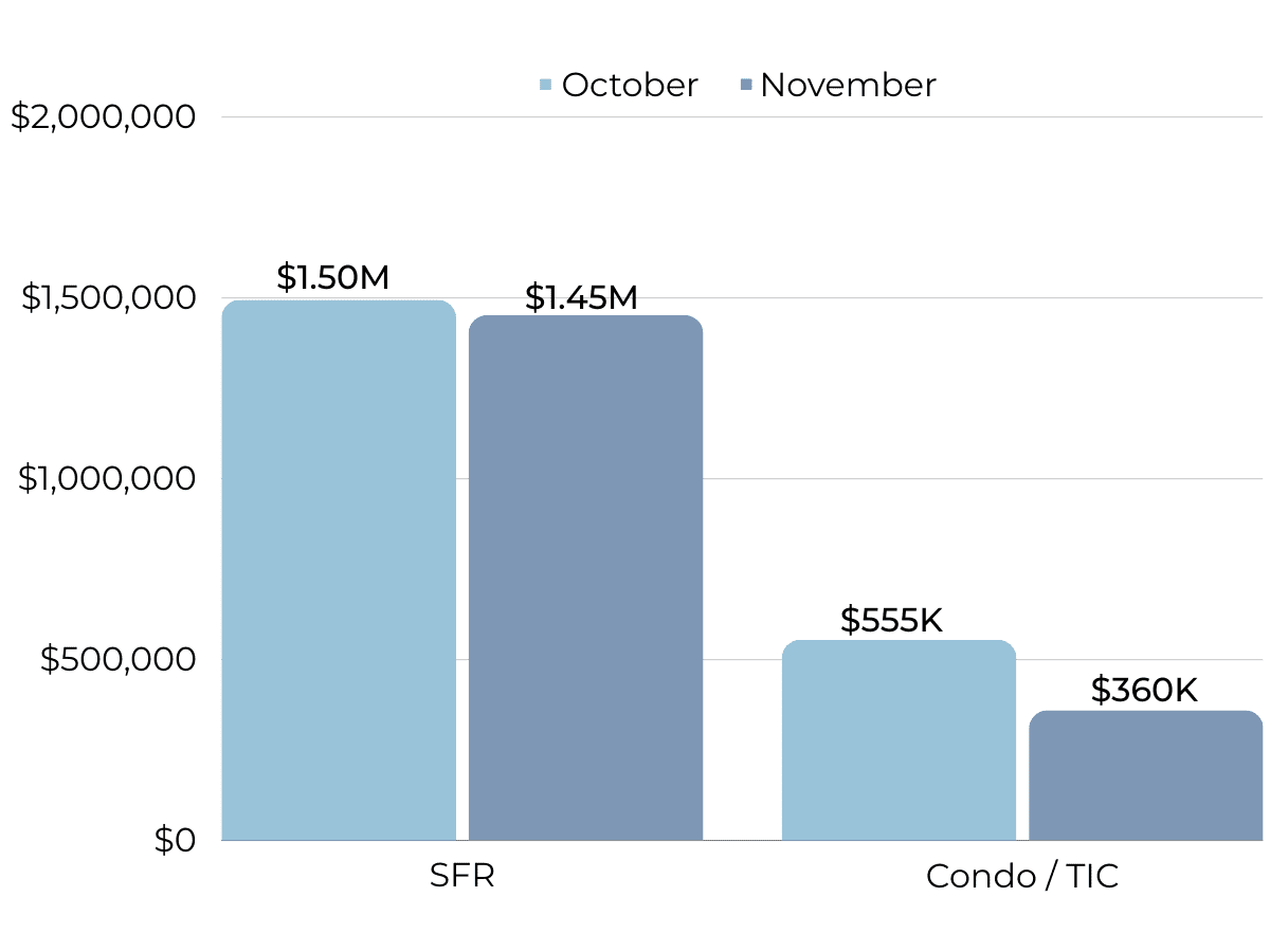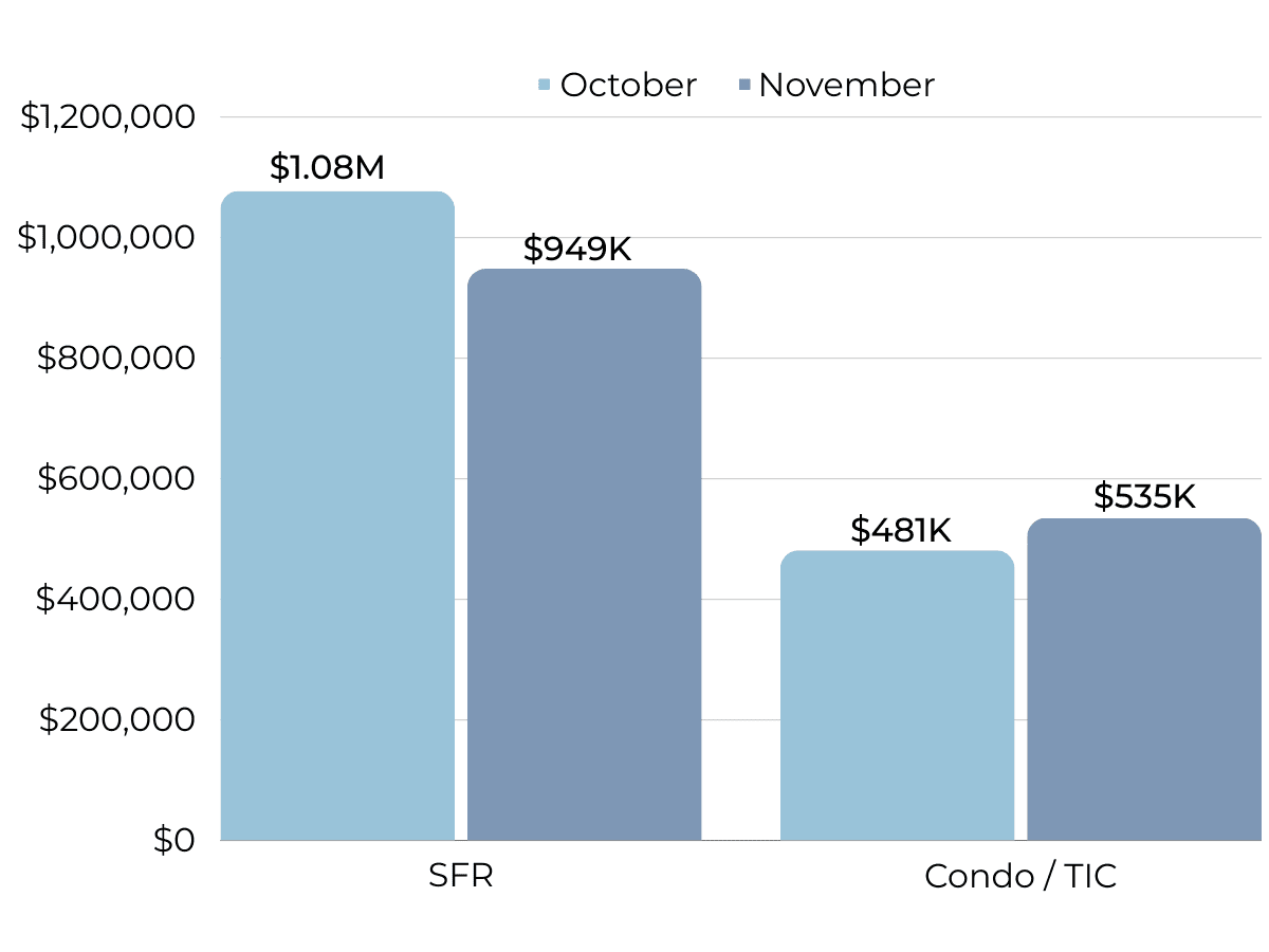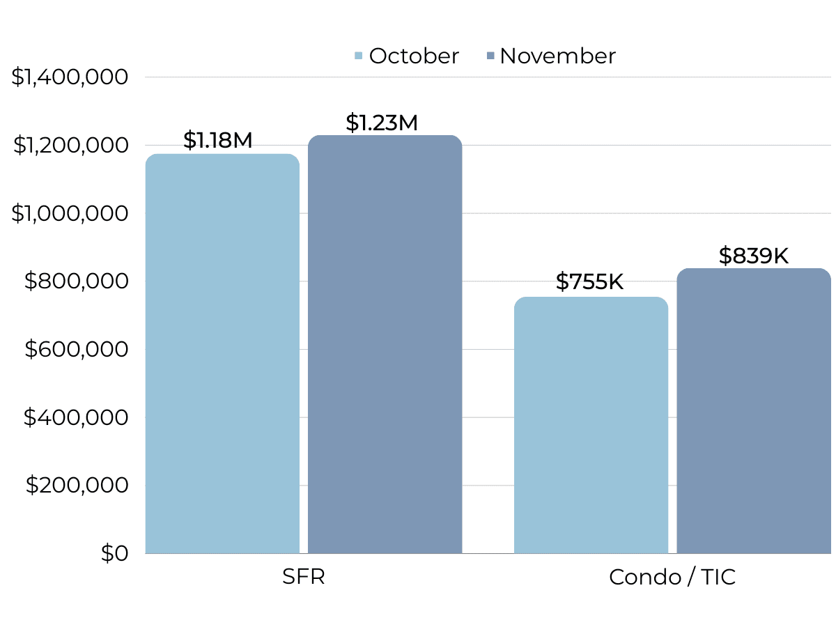 The median home sold price in Los Angeles was $970,149 in November 2023, down 2% from last year, and the median price per square foot was $618. Of the 1,182 sold homes, 47% were sold under asking, 12% were sold at asking, and 42% were sold over asking.