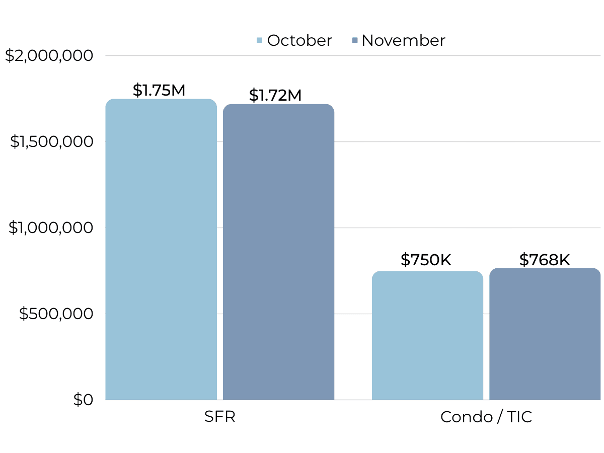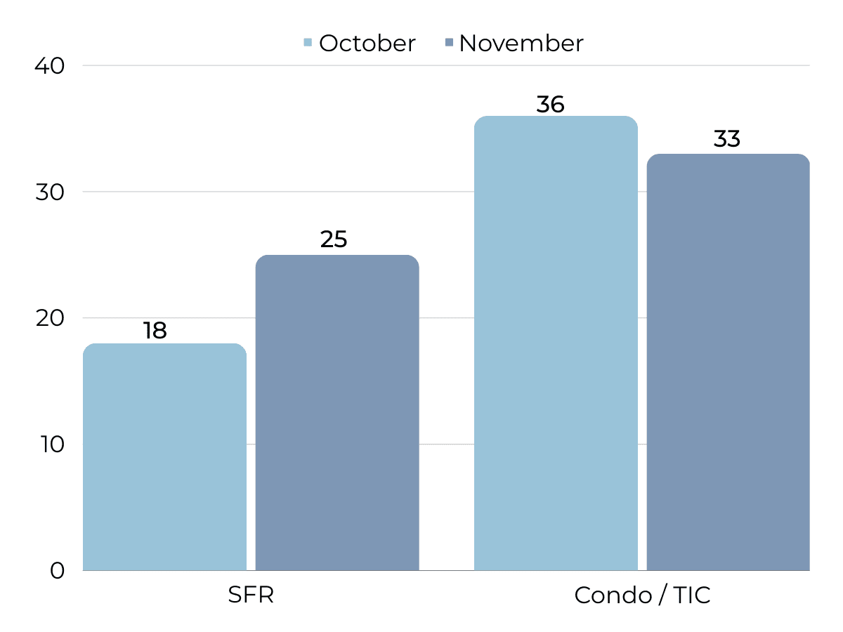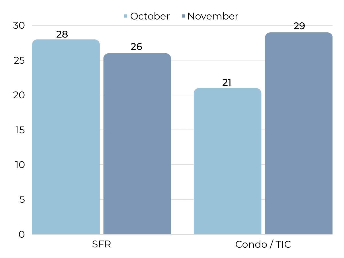 Since the start of 2023, single-family home inventory has followed fairly typical seasonal trends, but at significantly depressed levels. Low inventory and fewer new listings have slowed the market considerably. Typically, inventory peaks in July or August and declines through December or January, but the lack of new listings prevented meaningful inventory growth. This year, sales and new listings peaked in May, while inventory peaked in September. New listings have been exceptionally low, so the little inventory growth this year was driven by softening demand. In November, inventory, sales, and new listings dropped, which is normal this time of year. With the current low inventory levels, the number of new listings coming to market is a significant predictor of sales. Month over month, new listings fell 30% and sales declined 25%. Year over year, sales and new listings are down 17% and 8%, respectively.