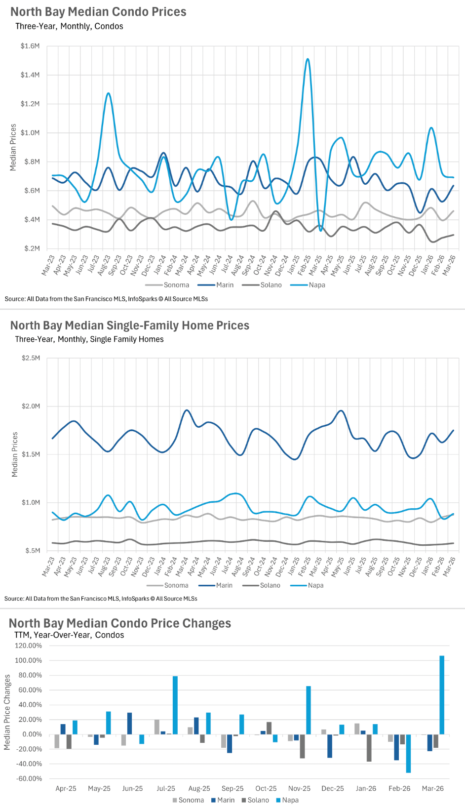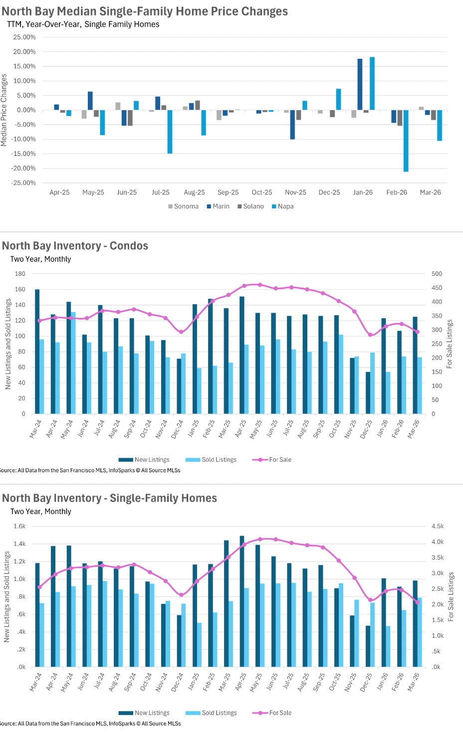 Inventory remains one of the biggest constraints in the North Bay. Single-family home supply is down more than 40% year-over-year, while condo inventory has dropped over 30%. Although new listings and sales activity are beginning to pick up with the spring season, overall supply is still well below last year’s levels—keeping competition elevated for buyers.