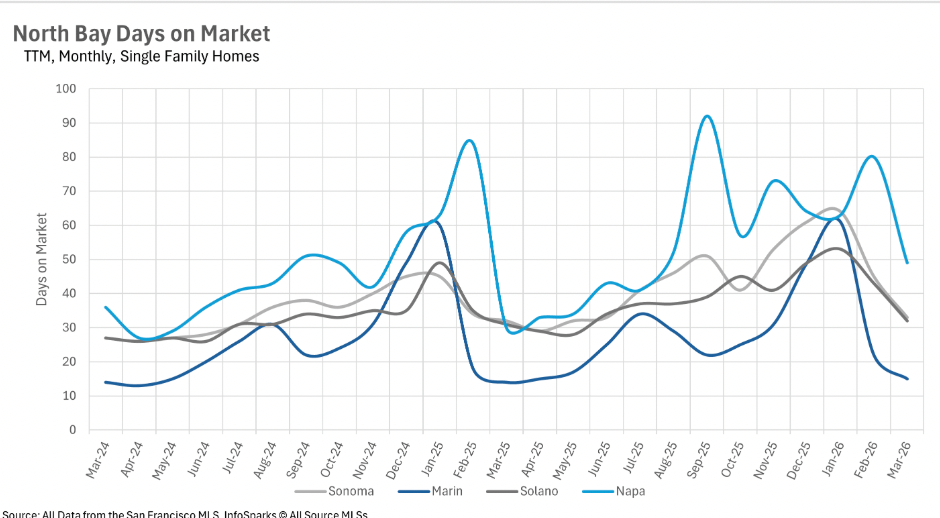 Homes are selling much faster than they were just a month ago. Days on market have dropped significantly across all counties, with especially strong improvements in Marin and Napa. While some markets are still tracking close to last year’s pace, the overall trend points to accelerating demand as we move deeper into the spring selling season.