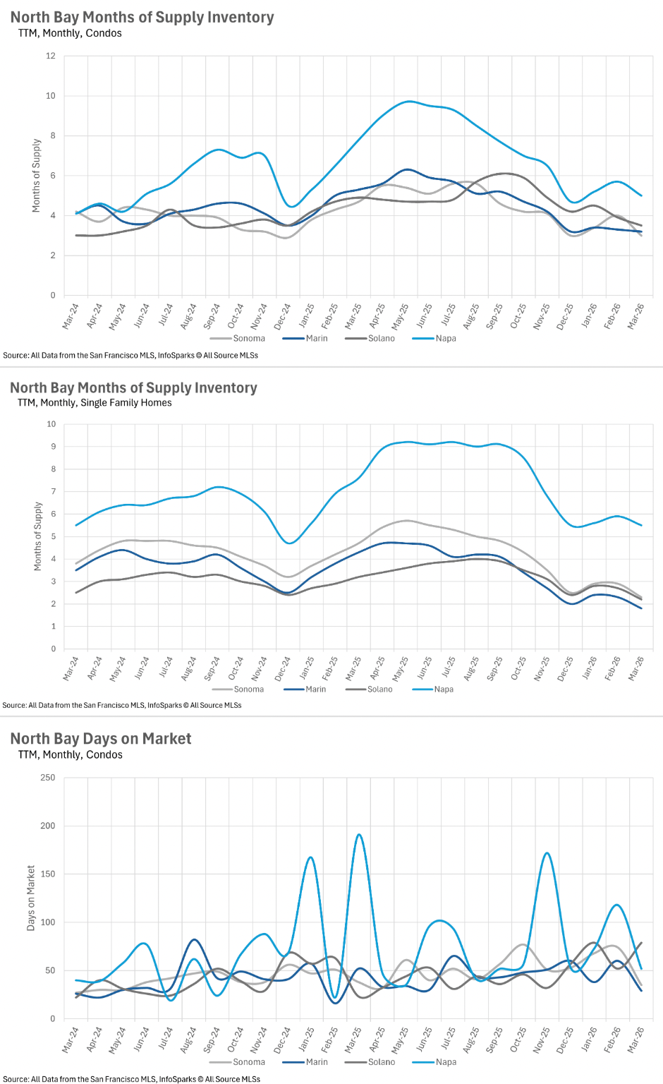 Overall, the North Bay remains largely a seller’s market. Most counties are operating with well under three months of inventory, giving sellers a clear advantage. Napa stands out as a more balanced market, offering slightly more breathing room for buyers. As inventory remains tight and demand continues to build, sellers are well-positioned, while buyers should be prepared to act quickly and competitively.