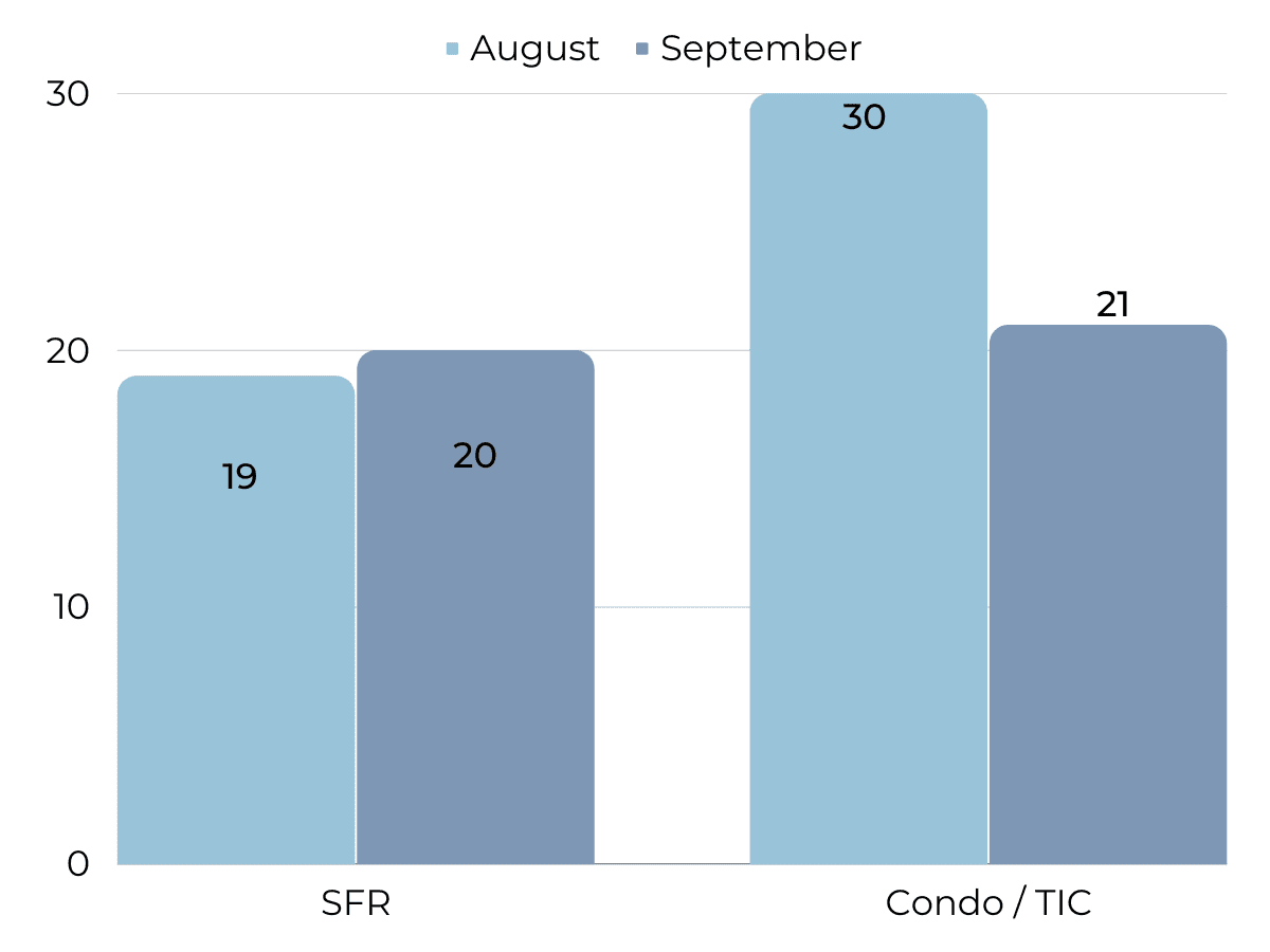 Months of Supply Inventory (MSI) quantifies the supply/demand relationship by measuring how many months it would take for all current homes listed on the market to sell at the current rate of sales. The long-term average MSI is around three months in California, which indicates a balanced market. An MSI lower than three indicates that there are more buyers than sellers on the market (meaning it’s a sellers’ market), while a higher MSI indicates there are more sellers than buyers (meaning it’s a buyers’ market). The North Bay market tends to favor sellers, especially for single-family homes, which is reflected in its low MSI. Even with the slight increase in MSI over the summer months, the market still firmly favors sellers. The only exceptions are single-family homes in Napa, which are closer to a balanced market.