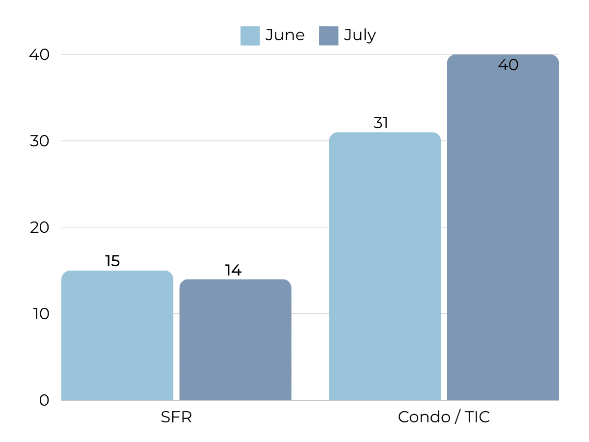 Average sale price decreased in July, marking the first drop in value after 6 months of price increases. Again, this is typical Summer housing market behavior expected to improve in the Fall. In welcome news for sellers, properties are selling on average at 4% over their asking price though this number has decreased over the past couple of months in this slower season of real estate. However, between 55%-60% of homes have been selling consistently over asking price, despite overbidding dropping a bit. Typical of the summer season, average price per sqft has lessened by about 4%, expected to bounce back in the Fall.
