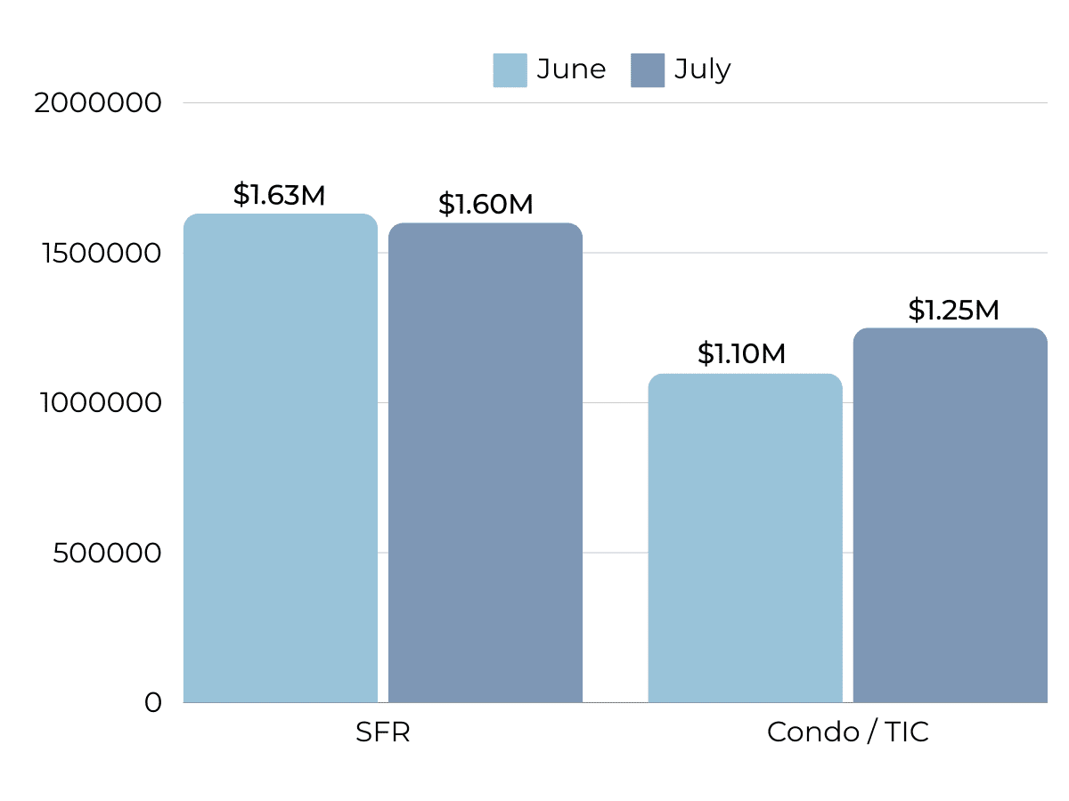 New listings dipped in July, marking the third month of decreasing new inventory. This is to be expected at this point in the market cycle. In fact, the highest amount of inventory generally hits the market around mid-Spring, picking back up around September at the start of the Fall market. Pending sales have dropped only slightly but remain relatively strong, again we expect the number of sales to slow down in the Summer before ticking up again in September. Listings sold have maintained a steady streak since March of this year, performing much stronger on average than 2023 sales. Total inventory has dropped for the past two months, hitting a low level in comparison to prior years. This tightening of inventory may be indicative of a seller’s market. Months supply is at 2.7 months due to less homes hitting the market but continued sales of available homes. We can expect that the Fall market will experience overbidding and strong buyer competition.