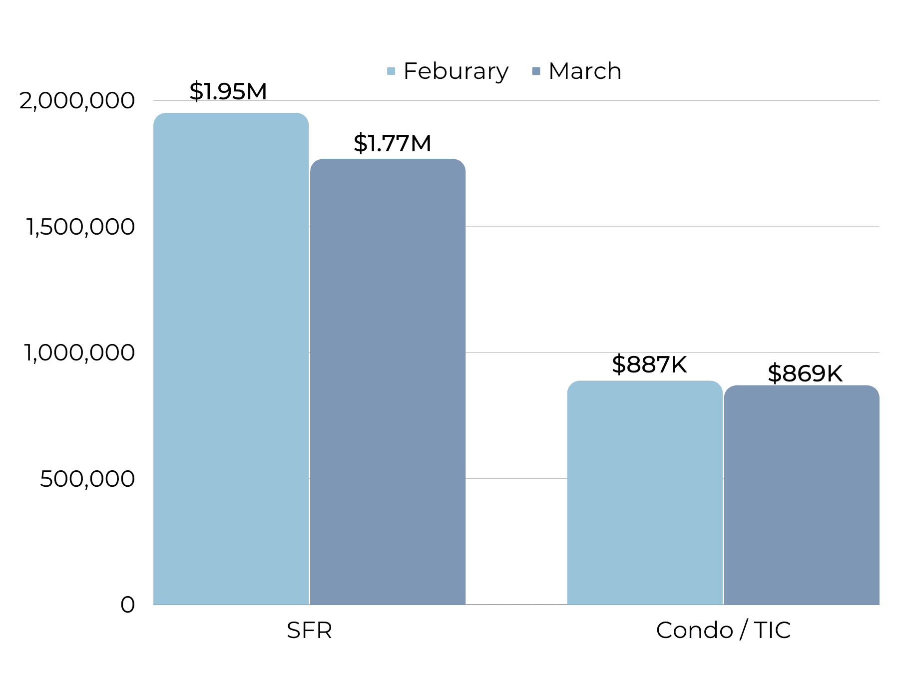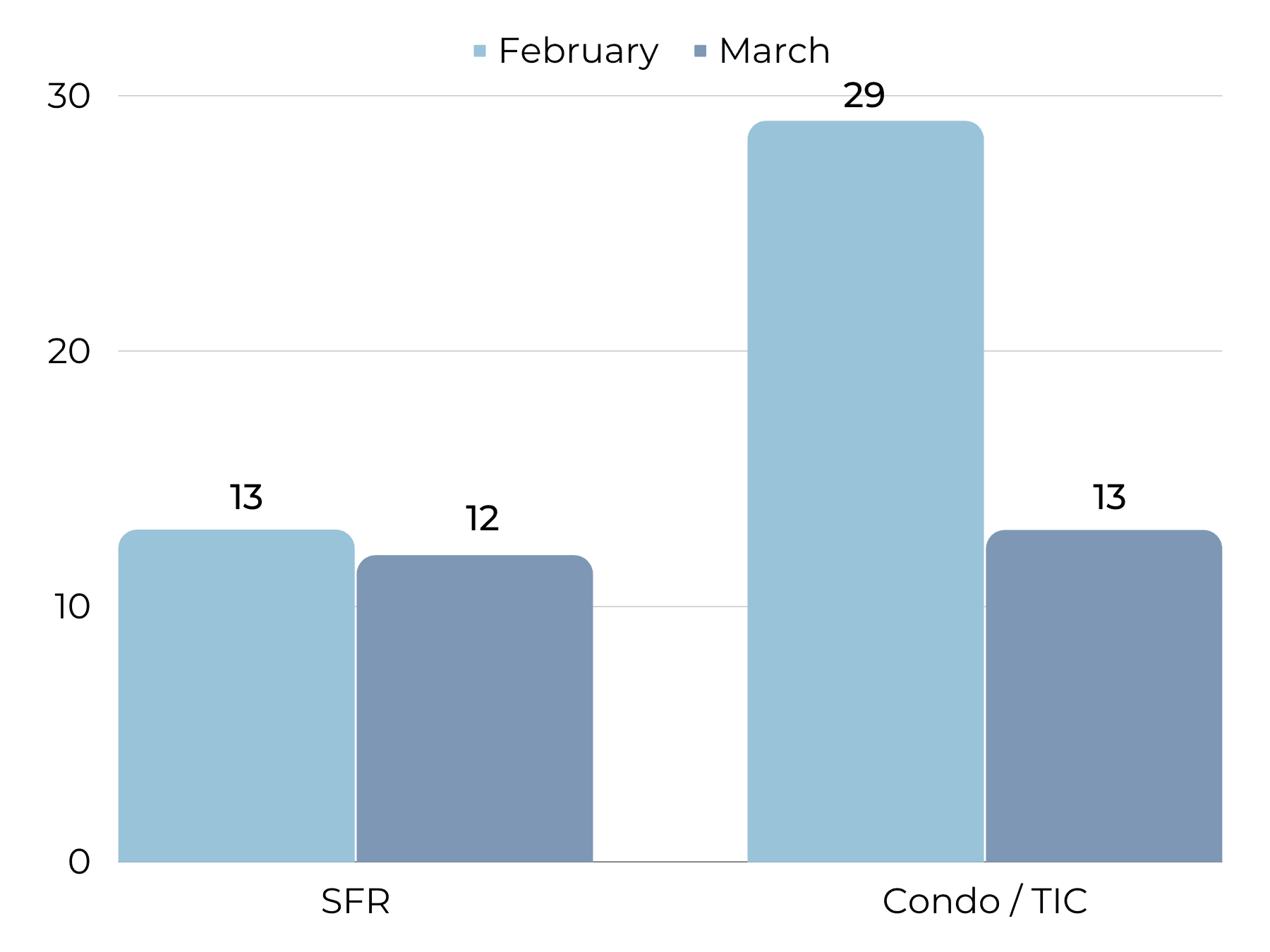 In a welcome turn for sellers, the average price for single family homes is increasing, making up for recent losses. The only time period where prices appear higher than they are now was February 2021-July 2022. Properties purchased during that time period may have depreciated, but for everyone else, home prices should be in a positive range. Despite rising prices after the holidays, condo prices have plateaued for now. After 4 months, homes in San Francisco are selling over asking once again, with single family homes receiving 7% over asking. Condos are still selling at under list price (1% under on average). Overall, 47% of homes on the market have sold over asking (this number was much higher during the Spring of 2018 and 2019).