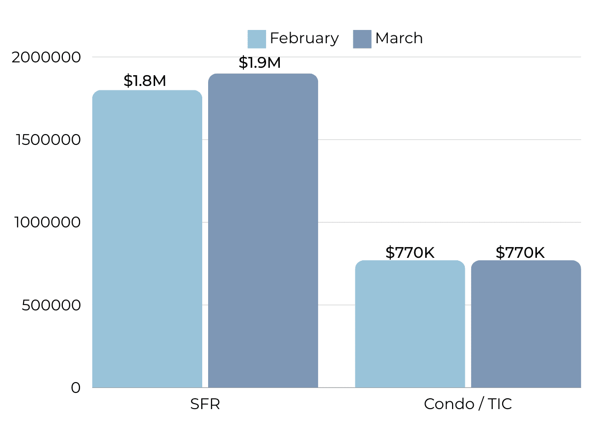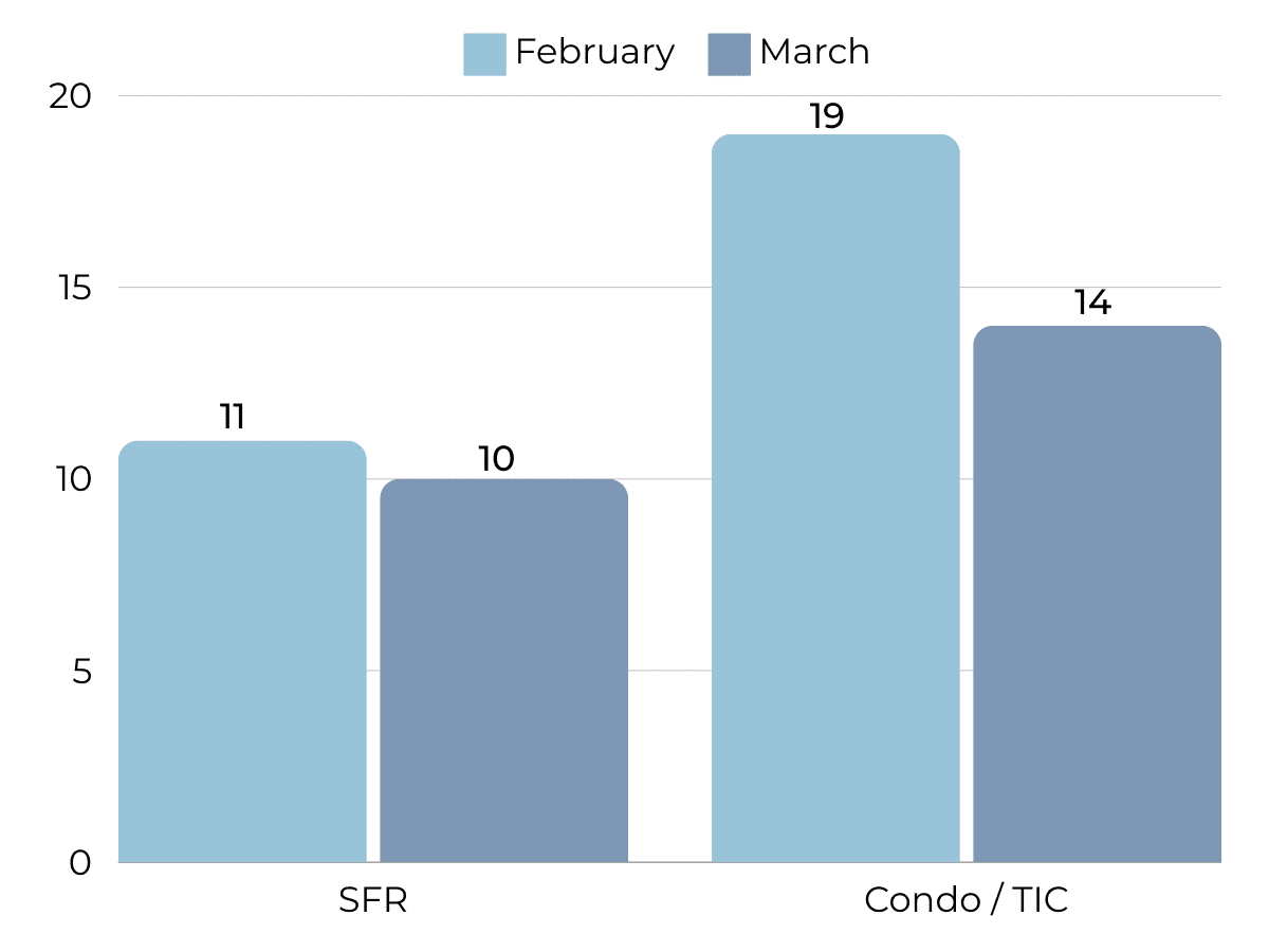 Months of Supply Inventory (MSI) quantifies the supply/demand relationship by measuring how many months it would take for all current homes listed on the market to sell at the current rate of sales. The long-term average MSI is around three months in California, which indicates a balanced market. An MSI lower than three indicates that there are more buyers than sellers on the market (meaning it’s a sellers’ market), while a higher MSI indicates there are more sellers than buyers (meaning it’s a buyers’ market). The Silicon Valley market tends to favor sellers, which is reflected in its low MSI. MSI fell sharply in the first quarter of 2023 before gently trending higher from May to November. In December, MSI declined sharply, but rose again in January. MSI contracted once again in February and currently indicates a sellers’ market for both single-family homes and condos.