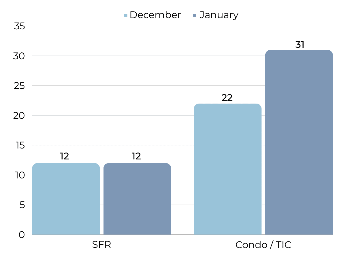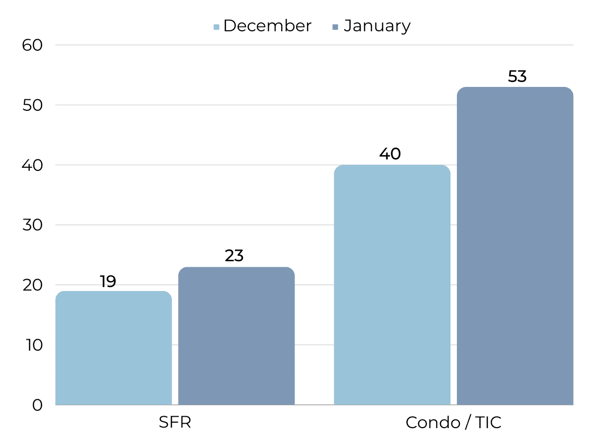 Single-family home and condo inventory barely increased at all last year, which is far from the seasonal norm. In 2023, inventory didn’t have anything resembling the typical sine wave, since far fewer sellers came to the market, especially in the first half of the year, and the low inventory and fewer new listings slowed the market considerably. New listings have been exceptionally low, so the little inventory growth last year was driven by softening demand. Typically, inventory peaks in July or August and declines through December or January. However, in 2023, inventory peaked in October, further highlighting the atypical supply trend. In November and December, inventory, sales, and new listings dropped, which is normal this time of year. With the current low inventory levels, the number of new listings coming to market is a significant predictor of sales. Month over month, new listings fell 53% and sales declined 9%. Total inventory is down 17% year over year.