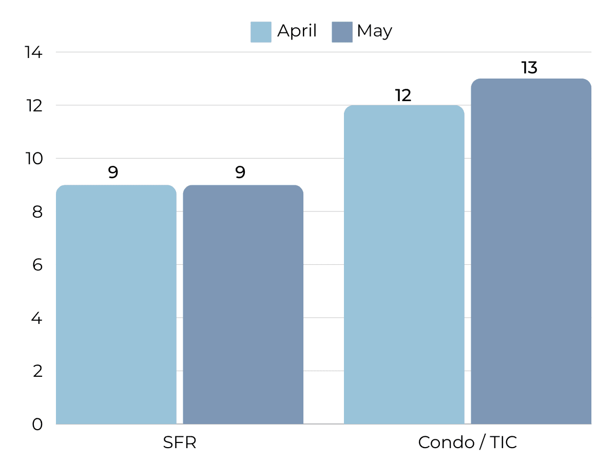 Months of Supply Inventory (MSI) quantifies the supply/demand relationship by measuring how many months it would take for all current homes listed on the market to sell at the current rate of sales. The long-term average MSI is around three months in California, which indicates a balanced market. An MSI lower than three indicates that there are more buyers than sellers on the market (meaning it’s a sellers’ market), while a higher MSI indicates there are more sellers than buyers (meaning it’s a buyers’ market). The Silicon Valley market tends to favor sellers, which is reflected in its low MSI. MSI trended higher in the second half of 2023, but never climbed above three months of supply. From January to April 2024, single-family home and condo MSI fell significantly, indicating the housing market strongly favors sellers.