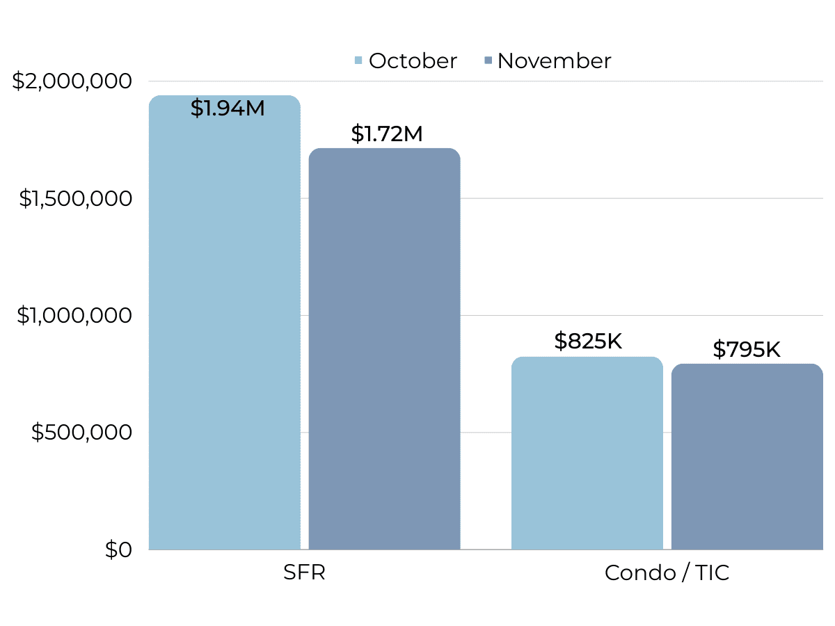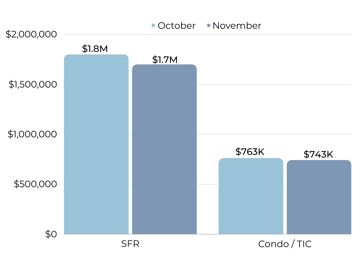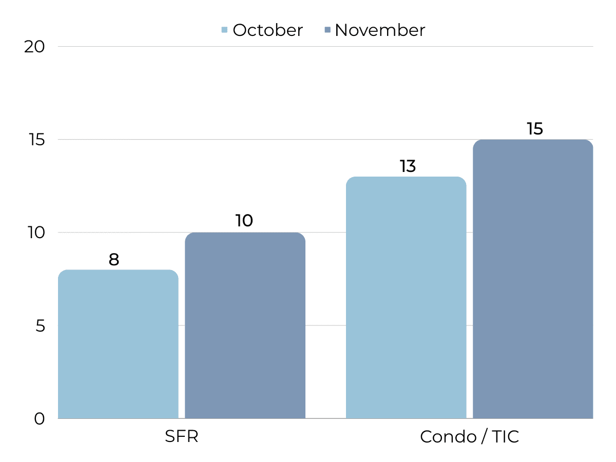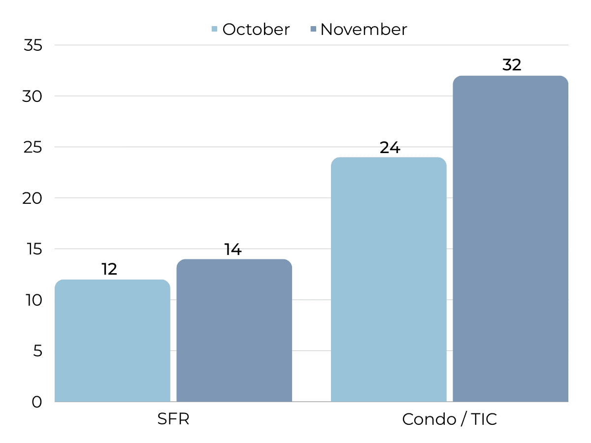 Single-family home and condo inventory barely increased at all this year, which is far from the seasonal norm. In 2023, inventory didn’t have anything resembling the typical sine wave, since far fewer sellers came to the market, especially in the first half of the year, and the low inventory and fewer new listings have slowed the market considerably. New listings have been exceptionally low, so the little inventory growth this year was driven by softening demand. Typically, inventory peaks in July or August and declines through December or January. However, this year, inventory peaked in September, further highlighting the atypical supply trend. In November, inventory, sales, and new listings dropped, which is normal this time of year. With the current low inventory levels, the number of new listings coming to market is a significant predictor of sales. Month over month, new listings fell 32% and sales declined 17%.
